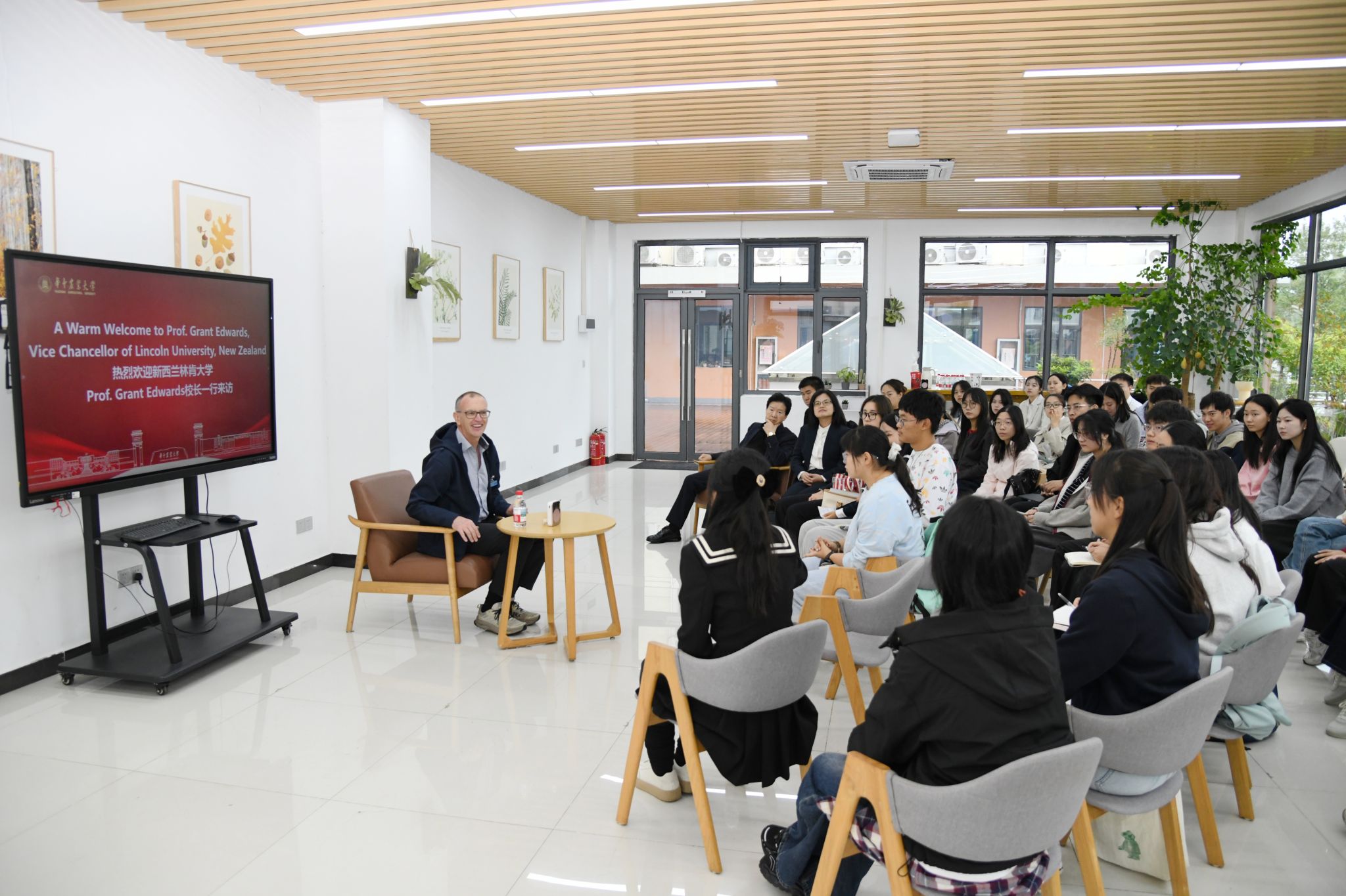 访问期间,代表团参观了湖北洪山实验室。Grant Edwards还与华农林肯学院40余名学生代表进行了面对面交流。在长达一小时的交流中,同学们围绕学业规划、学科交叉融合、职业发展、文化交流等话题踊跃提问。Grant Edwards谈到,华农林肯学院为同学们提供了独特的学习体验,希望大家珍惜这个机会,不断提升全球胜任力,同时也欢迎更多华中农大学子到林肯大学学习交流,通过优势学科的强强联合,共同应对全球粮食安全、气候变化等挑战。当谈及农业领域发展前景时,Grant Edwards表示,现代农业已发展成为融合生物技术、信息科学、经济管理等多学科的综合性领域,为同学们提供了广阔的发展空间。希望同学们保持求知欲和创新精神,在两校合作搭建的平台上追逐梦想。