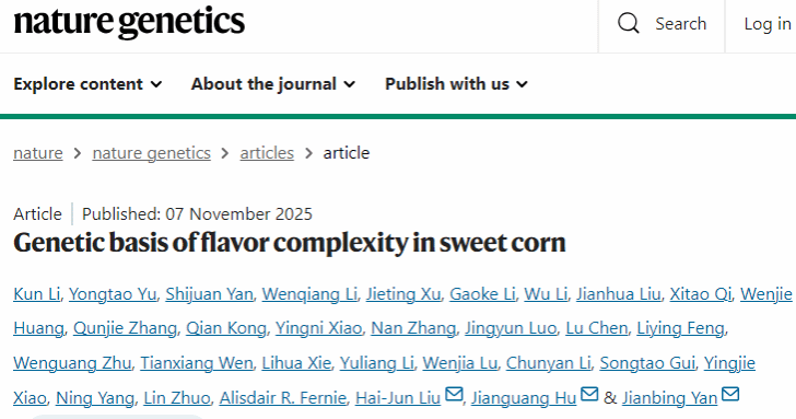 南湖新闻网讯(通讯员 李坤 刘海军)11月7日,国际学术期刊《自然-遗传学》(Nature Genetics)在线发表题为“Genetic basis of flavor complexity in sweet corn”(甜玉米风味复杂性的遗传基础)的研究文章,系统揭示了甜玉米风味形成的遗传基础。这项研究不仅打破了“甜即好吃”的传统育种观念,更提出了“风味设计”育种新方向,为培育既高产又美味的甜玉米品种、实现甜玉米产业高品质高效益升级提供了科学依据和技术路径。