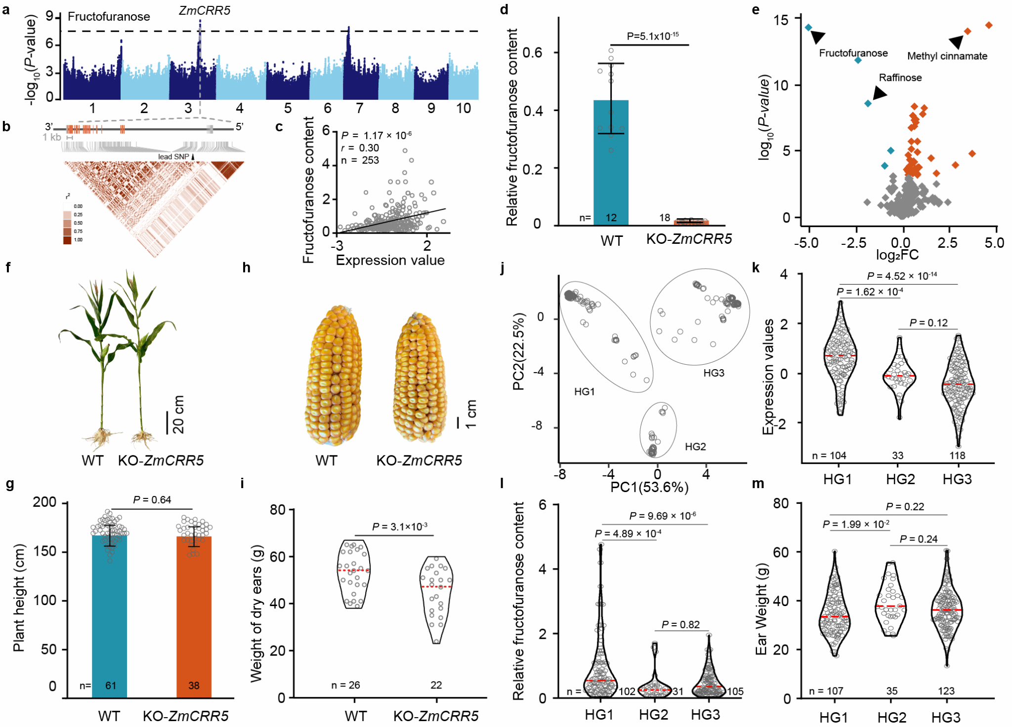 该研究的另一个核心突破在于揭示了风味与产量之间的内在权衡机制,并提出了“风味设计”育种新思路。通过多组学分析,团队鉴定到一批能同时调控产量和风味形成的关键基因与代谢物。例如,在自然群体中,基因ZmCRR5存在多种变异类型(等位基因型),其中一种相对低频(约13%)的等位型具有既高产又风味佳的特性。这类有利等位基因的挖掘为培育新品种提供了直接靶点。