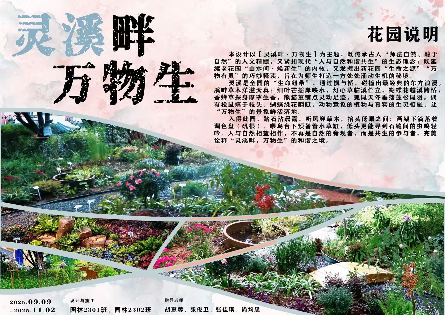 “灵溪畔·万物生”与“九畹蕙风”是园林2023级全体同学《花园设计与营建》课程结业作品。这里,图纸上的理念与景观,在夯土与植苗间化为触手可及的风景,而参与其中的每一位同学,也在项目制教学的推进中成长蝶变。