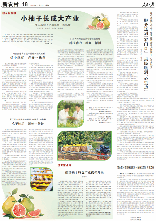 发展产业,关键靠人才。要健全产业服务体系,加强规范化的产业合作社建设,鼓励人才返乡创业。加强政产学研融合,促进科技成果快速转化。通过凝聚各方力量,让这颗小柚子持续不断成为带动群众增收、推动乡村全面振兴的“金果果”。