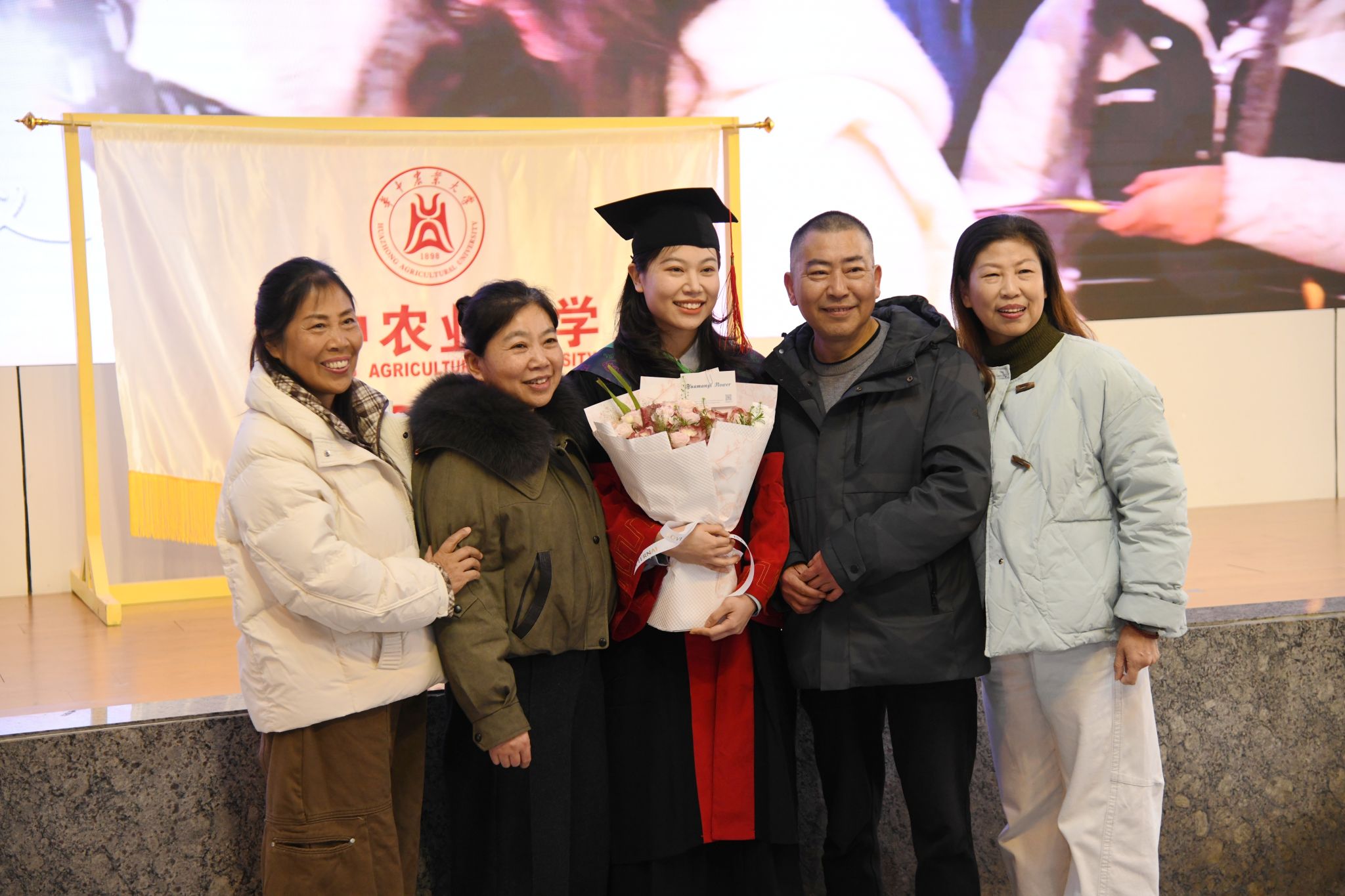 仪式现场,承载着特殊意义的“华中农业大学2025年毕业纪念旗”置于前方正中。今天,有461名毕业生在此加冕,他们即将启程,奔赴各自广阔天地,谱写崭新篇章。