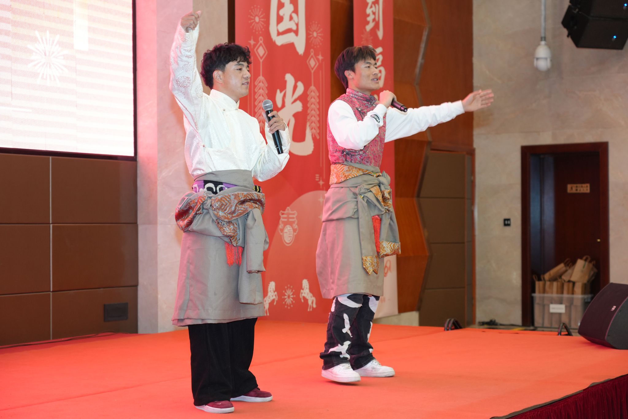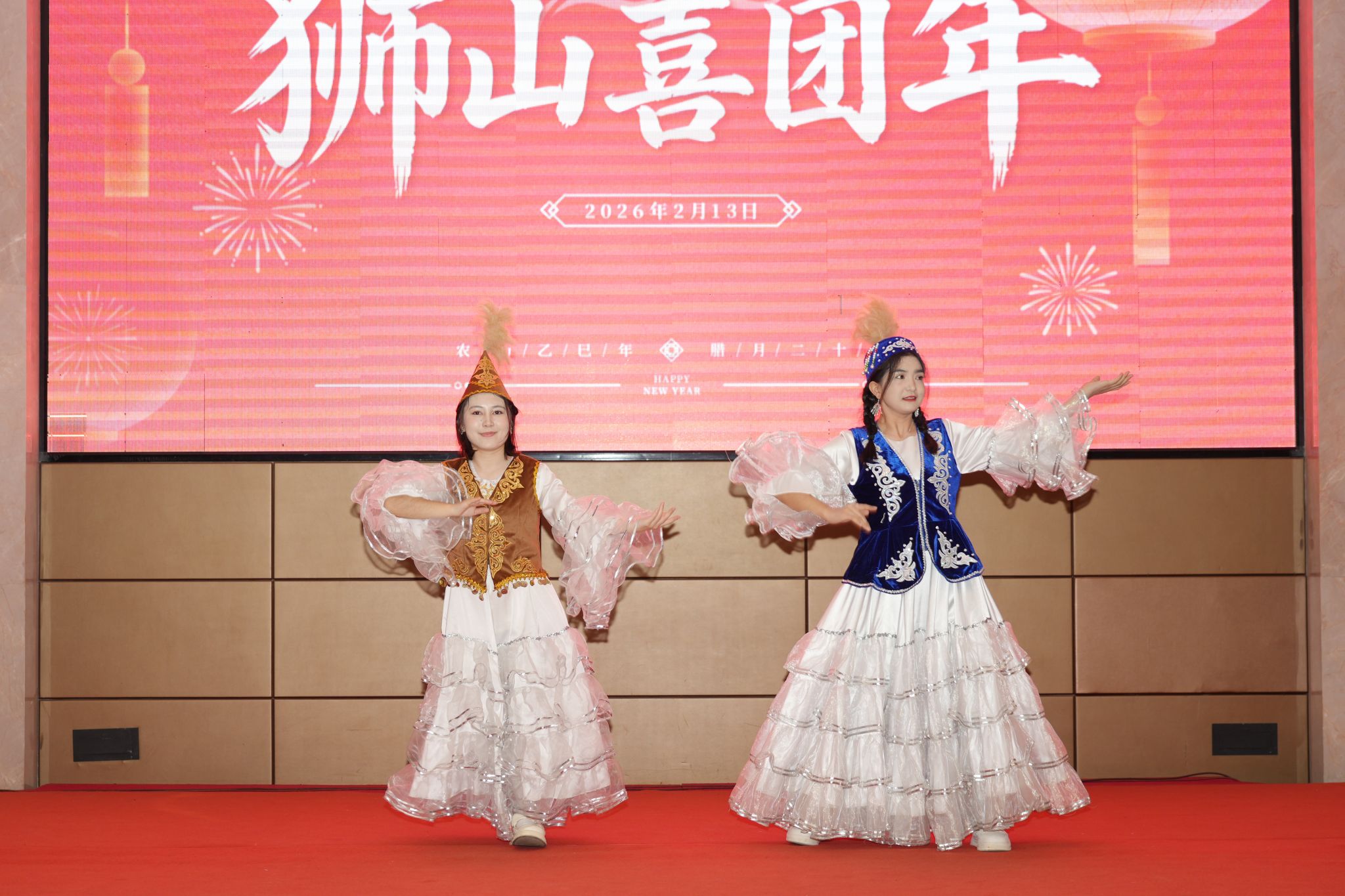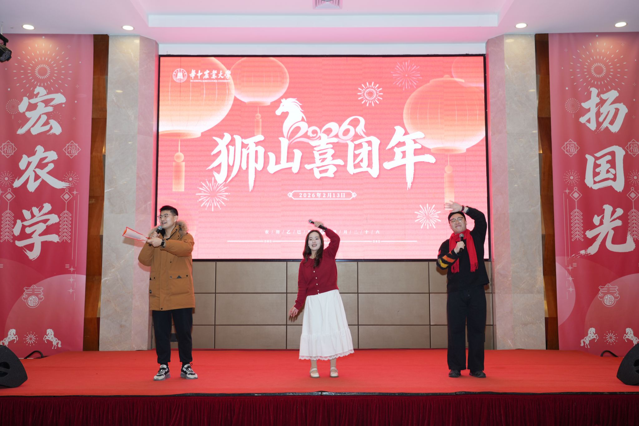 下午五时许,团年饭正式开席。经济管理学院辅导员徐嘉楠、化学学院辅导员李祥瑞、文法学院辅导员张思琪携手登台,以一首活力满满的《奔跑》点燃现场气氛,祝福大家在丙午马年里,策马扬鞭、奋勇争先,跑出人生加速度、续写发展新篇章。