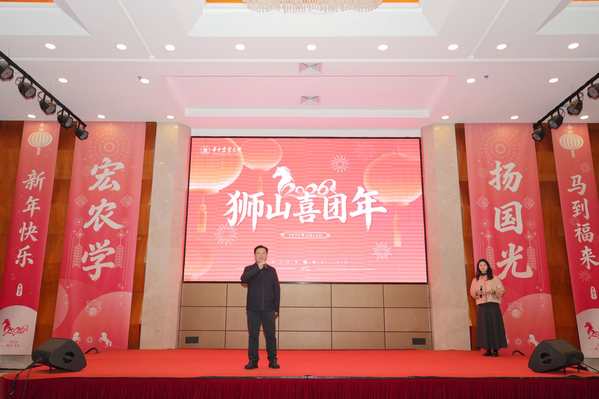 南湖新闻网讯(记者 晏华华)灵蛇辞旧岁,骏马踏新春。2月13日,农历腊月廿六,年味渐浓,国际学术交流中心张灯结彩、喜乐融融,2026狮山喜团年活动温情启幕。校党委书记姚江林等全体在校校领导,各职能部门、学院负责人与留校师生欢聚一堂,围坐叙情、共贺新岁。