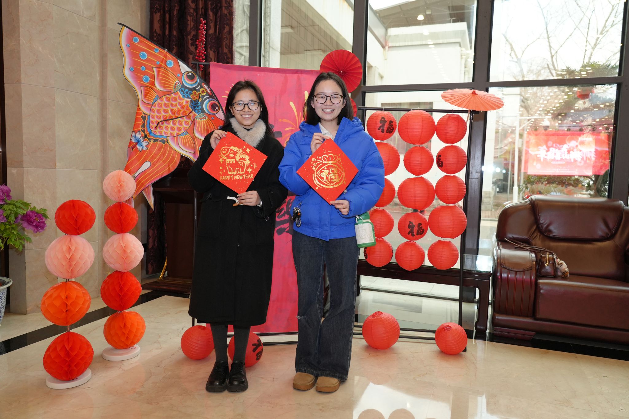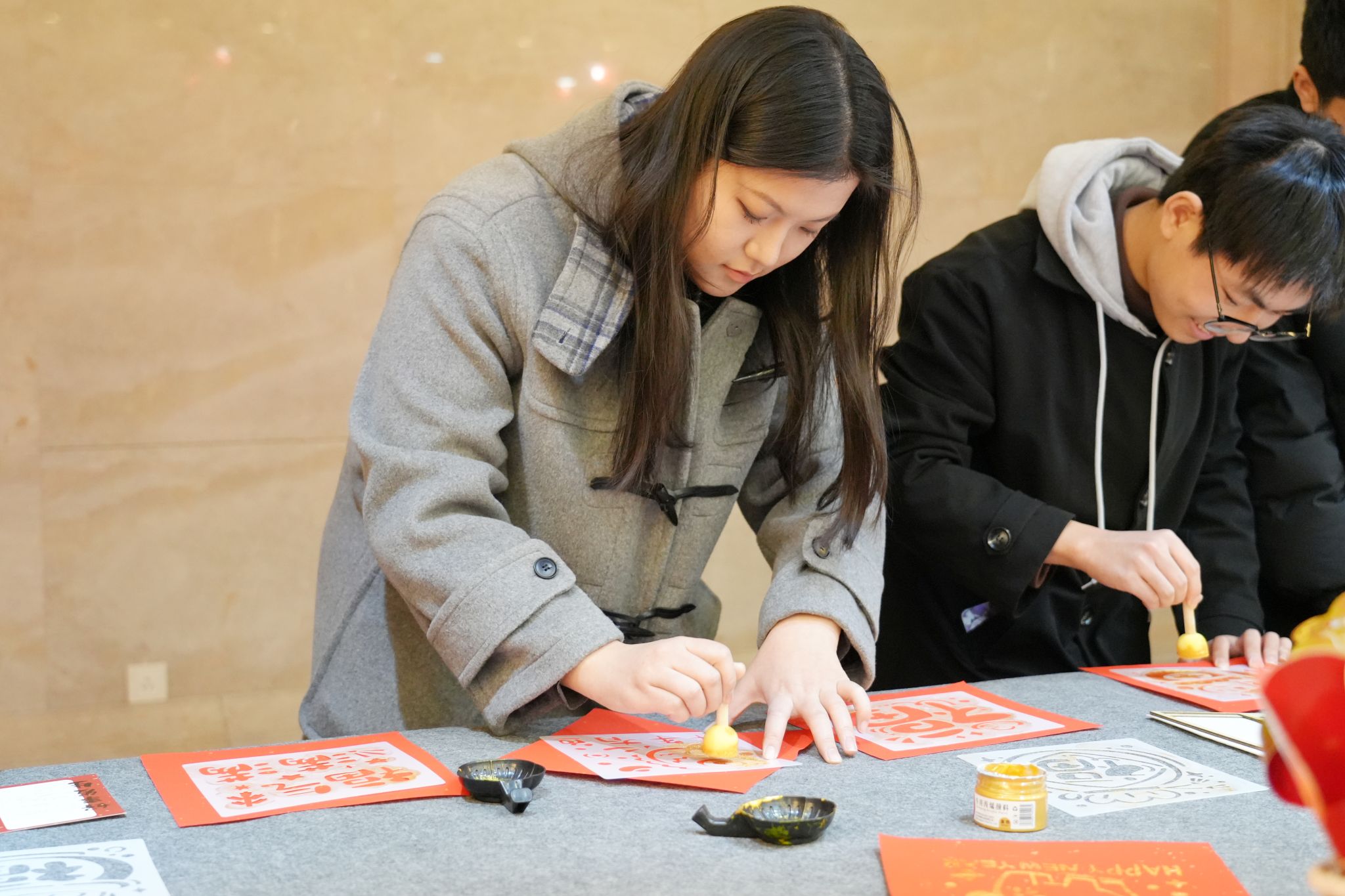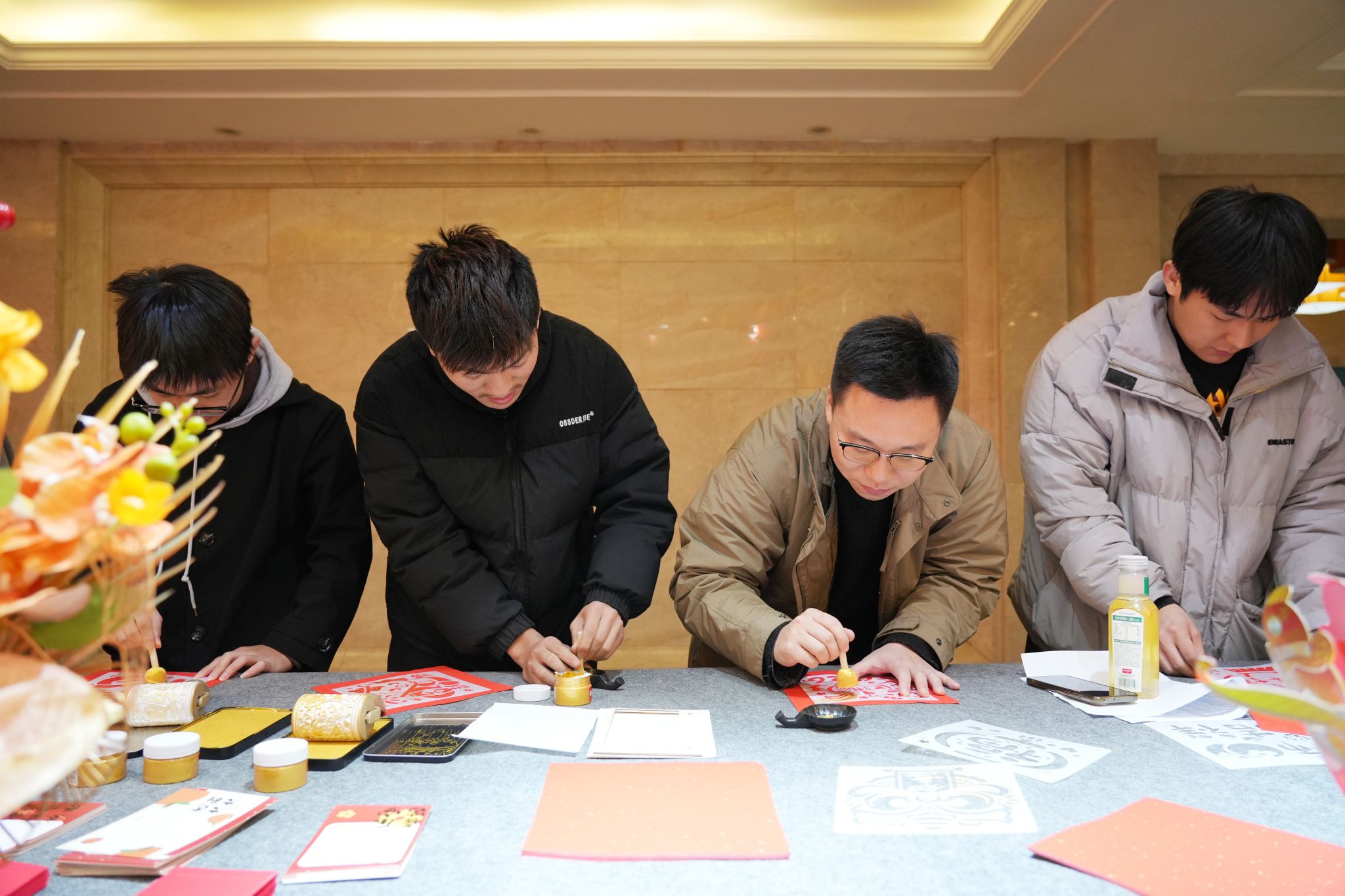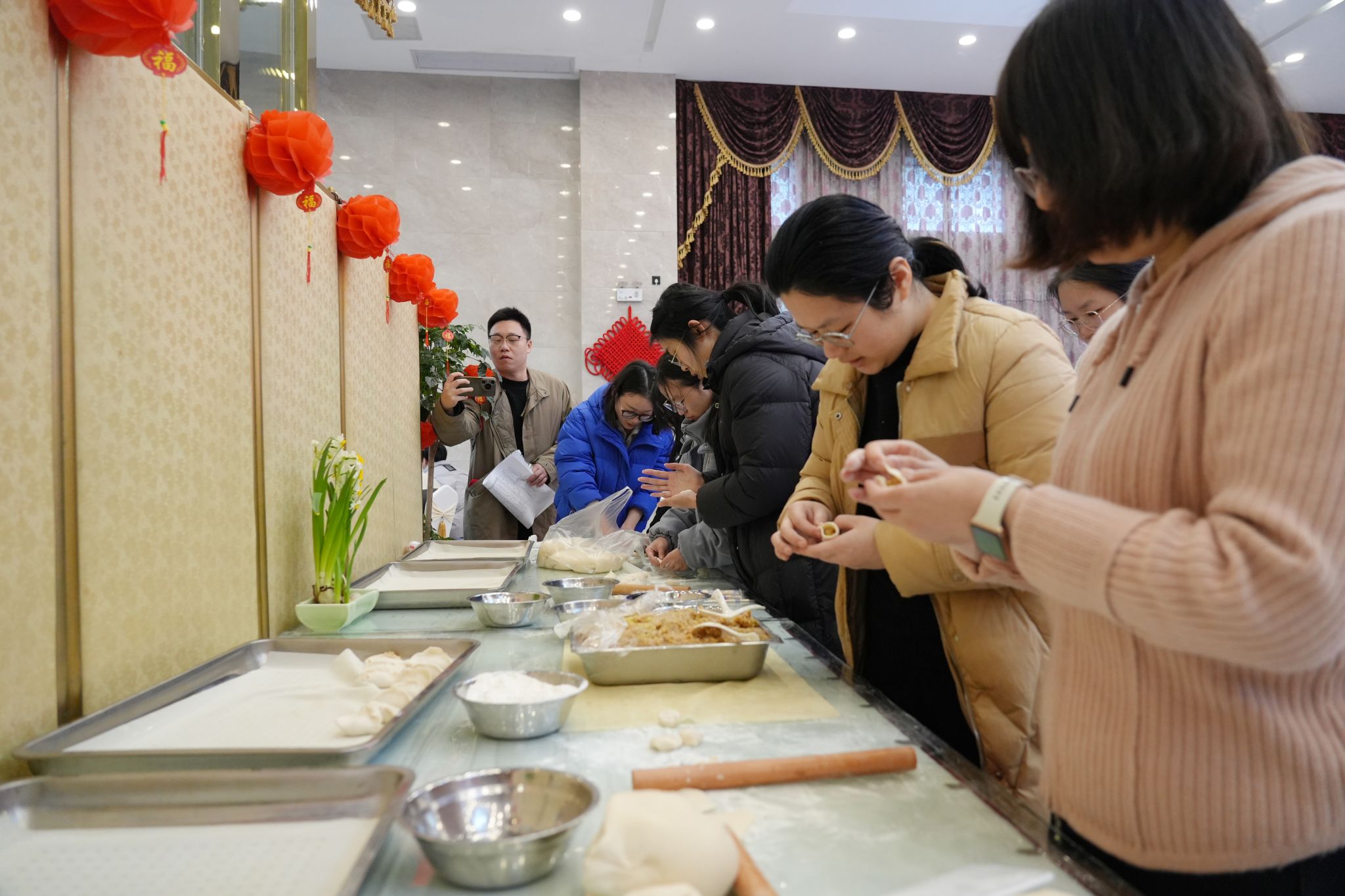 立春已过,狮山草木初萌,暖阳和煦拂面,处处洋溢着春的生机与年的喜庆。活动现场硕彦厅内,红灯笼高悬、中国结点缀,鲜红的春联纸整齐铺展,精致的福字贴满墙面,一张张圆桌整齐排列,桌上瓜果飘香、暖意氤氲。