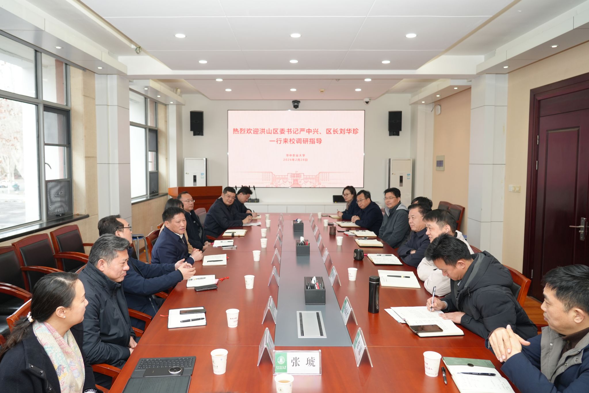 严中兴充分肯定了我校及洪山实验室为区域发展作出的重要贡献,衷心感谢学校长期以来对洪山区工作的大力支持。他表示,华中农大是洪山区不可或缺的创新源泉与发展伙伴,洪山区将全力以赴为学校建设发展提供政策支持和服务保障,着力打造环华农创新发展带,推动区校实现更高水平合作共赢。刘华珍向我校广大师生致以新春问候,表示新的一年区政府将加速打造“狮山硅巷”,重点培育生物育种等特色集群,持续为华农科技成果转化提供全方位支持,促进更多农业科技前沿成果在洪山落地转化、孵化壮大。