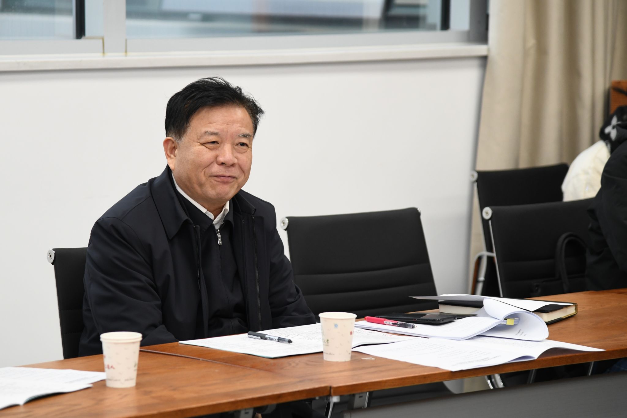 在三教A201教室,校党委书记姚江林来到马克思主义学院孔浩老师的《习近平新时代中国特色社会主义思想概论》课堂听课。