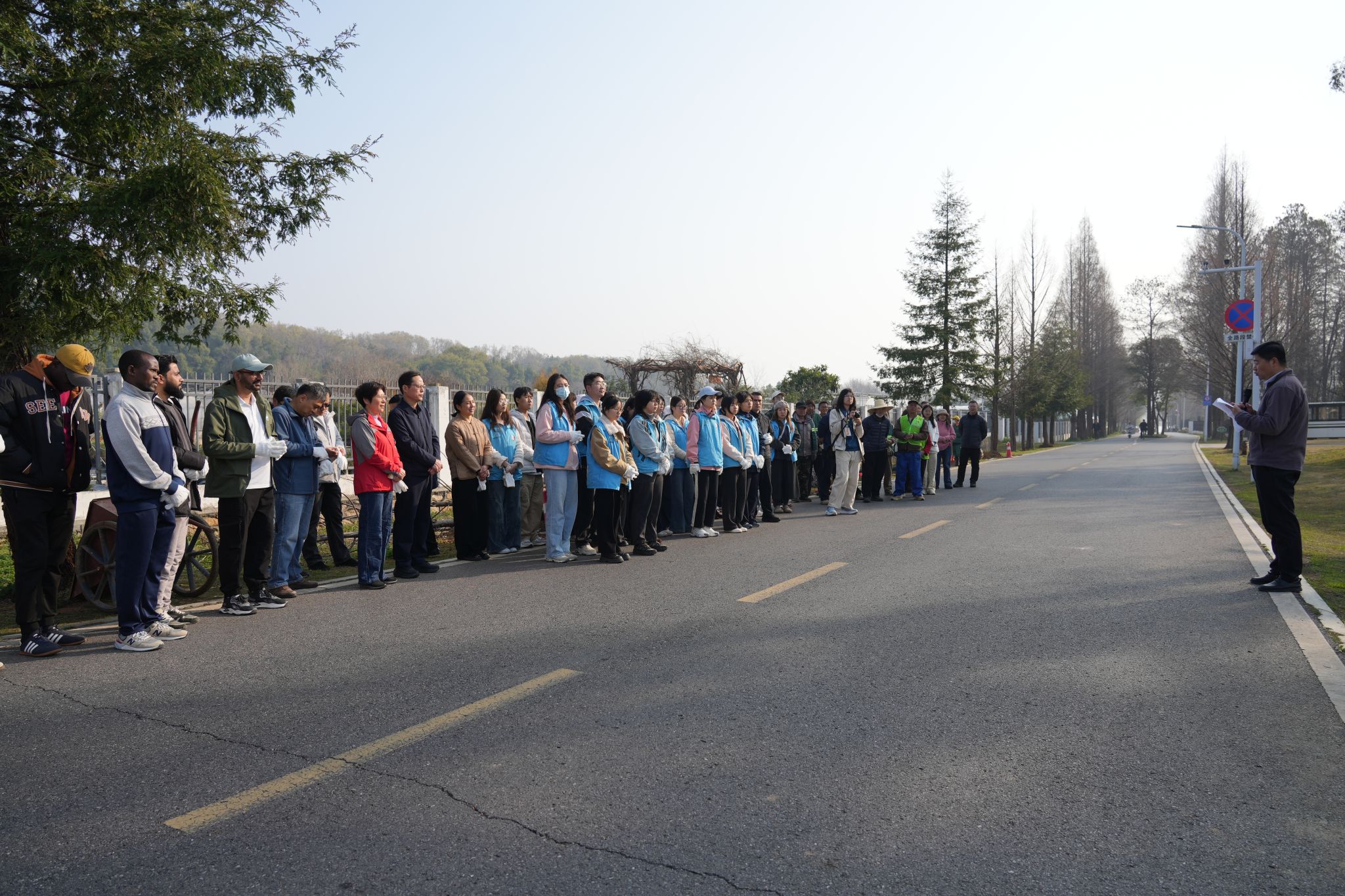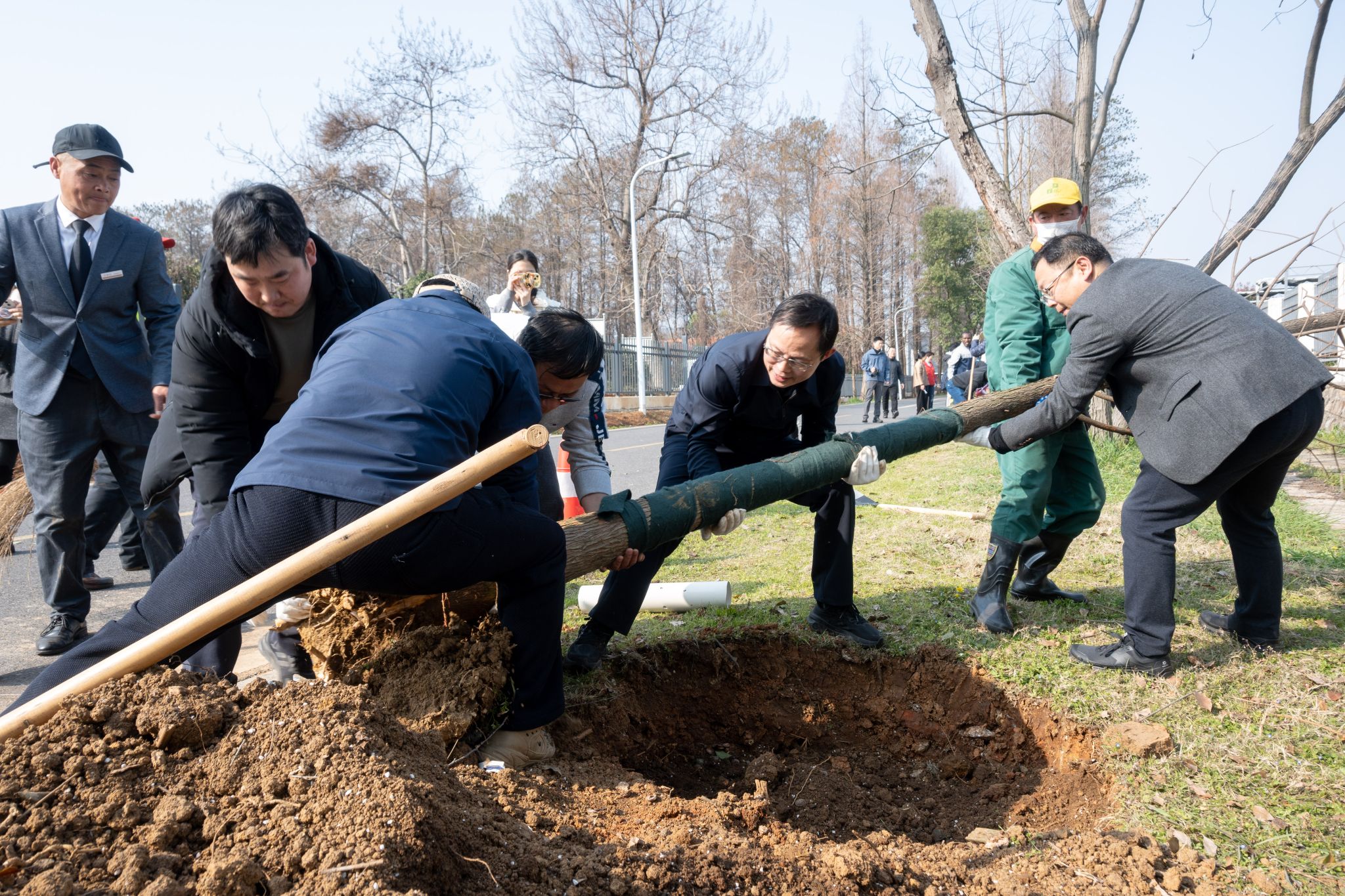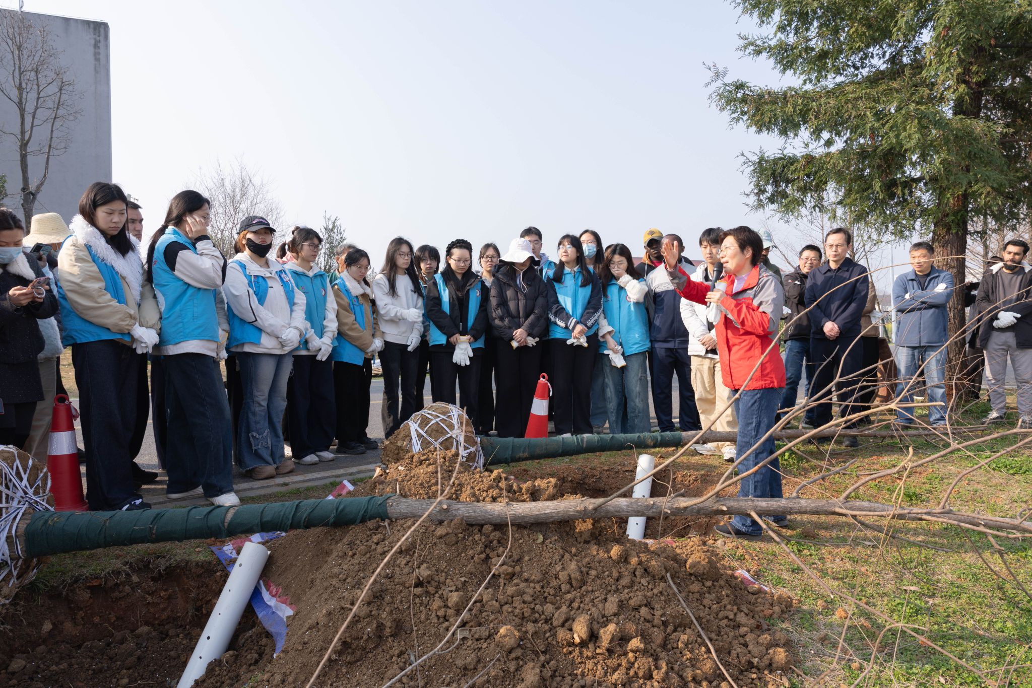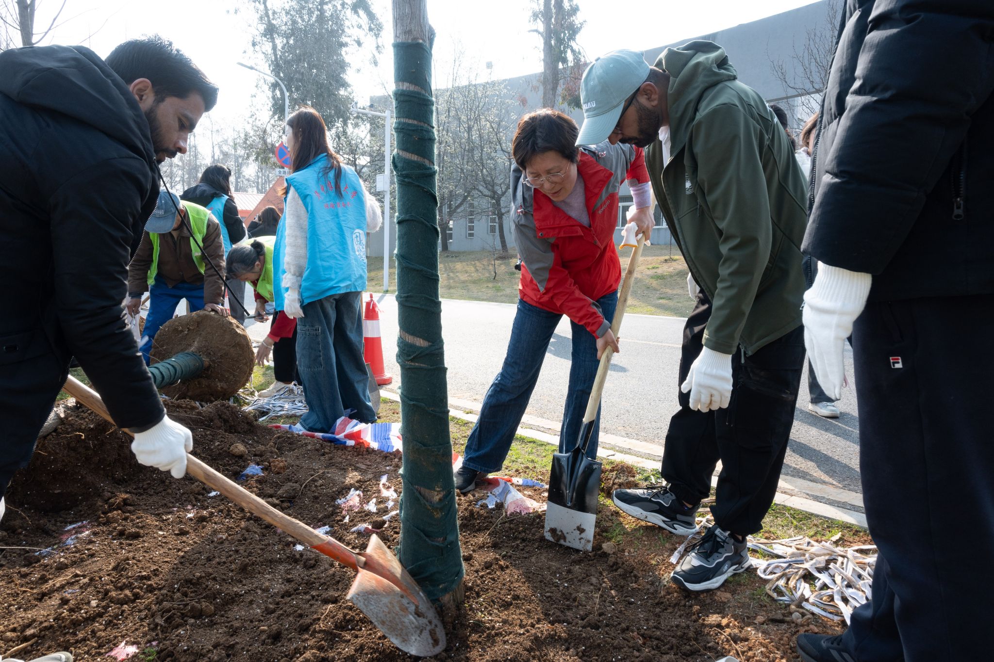 现场师生三五成组,分工协作、挥锹铲土。大家扶苗填坑、踩实培土,遵循技术要领完成每一道工序,将一棵棵水杉树苗稳稳栽下。校领导与师生、园林工作者并肩劳动,现场氛围热烈有序。