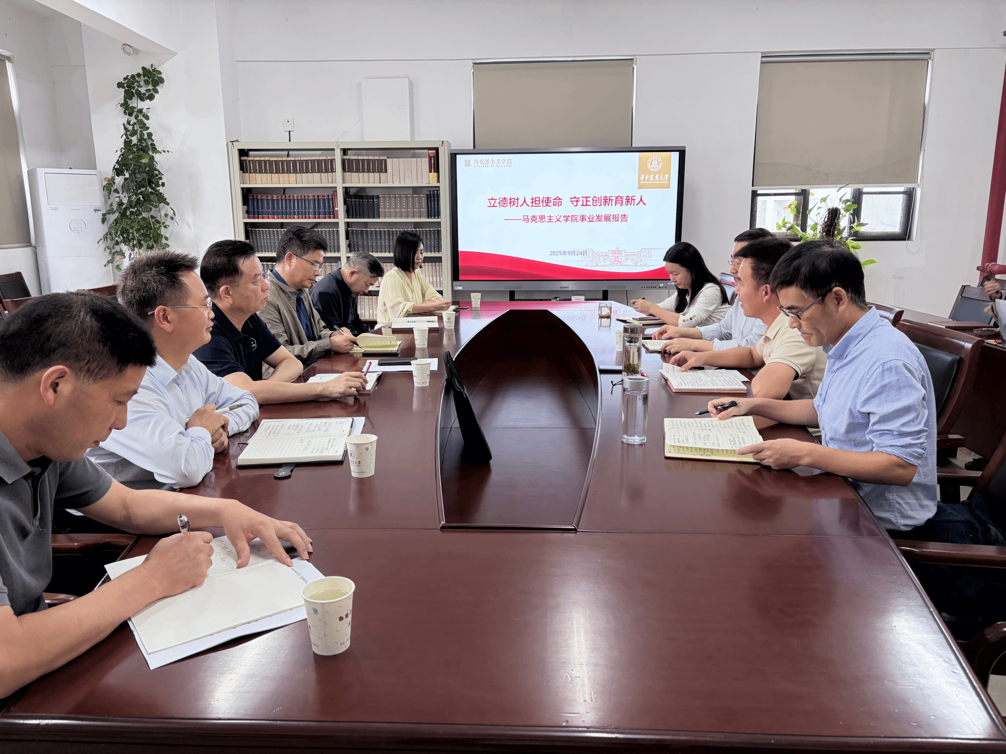 马克思主义学院院长梁伟军代表学院班子围绕“立德树人担使命,守正创新育新人”,重点从发展现状、存在问题,对策措施三个方面系统汇报了学院工作情况。与会职能部门负责人围绕数智课程建设、思政课集体备课、学科方向凝练、研究生学术动力激发、师资队伍建设、党建思政品牌创建等方面提出了诸多中肯意见和建议。