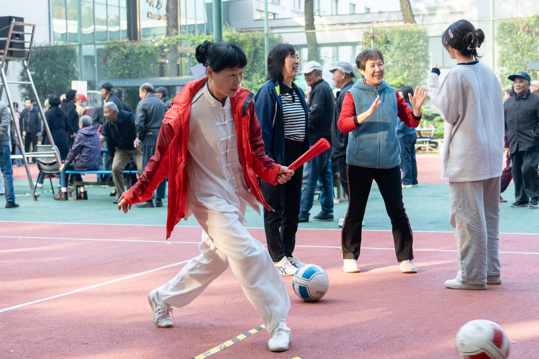在舒缓的音乐中,由18位离退休教职工组成的太极扇队开始表演,队员们动作如行云流水,刚柔并济,整齐划一,引来阵阵欢呼,现场掌声如雷。同时,各比赛场地内活动如火如荼地进行,参赛者们兴致勃勃,跃跃欲试。建高楼场地内,每位参赛者都屏息凝神,小心翼翼,最终公共管理学院87岁的肖刚老师以20个的好成绩夺得该项目第一名。趣味钓鱼场地内一片欢声笑语,参赛者们手握“鱼竿”钓起玩具小鱼。75岁及以上的组别内,在欢笑声与喝彩声中,来自校园建设与安全保卫部的田先春老师以21条小鱼的成绩夺魁。