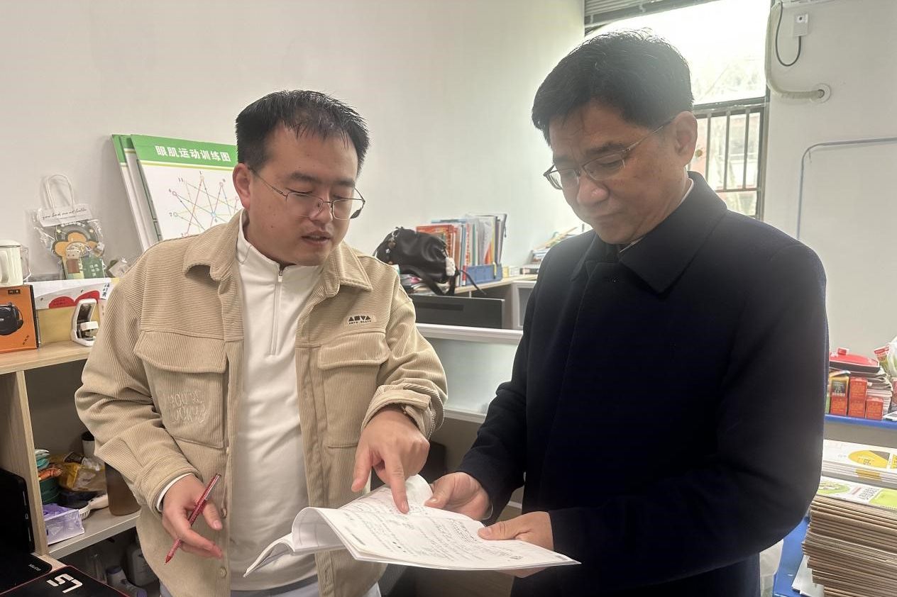 李向东还走进教师办公室,向大家表示慰问。他走到吕秋铭老师桌前,拿起学生作业仔细查看,并指出要严格落实“一科一辅”,规范课外读物进校园管理,努力实现教育教学的提质减负,让学生、家长和教师满意。