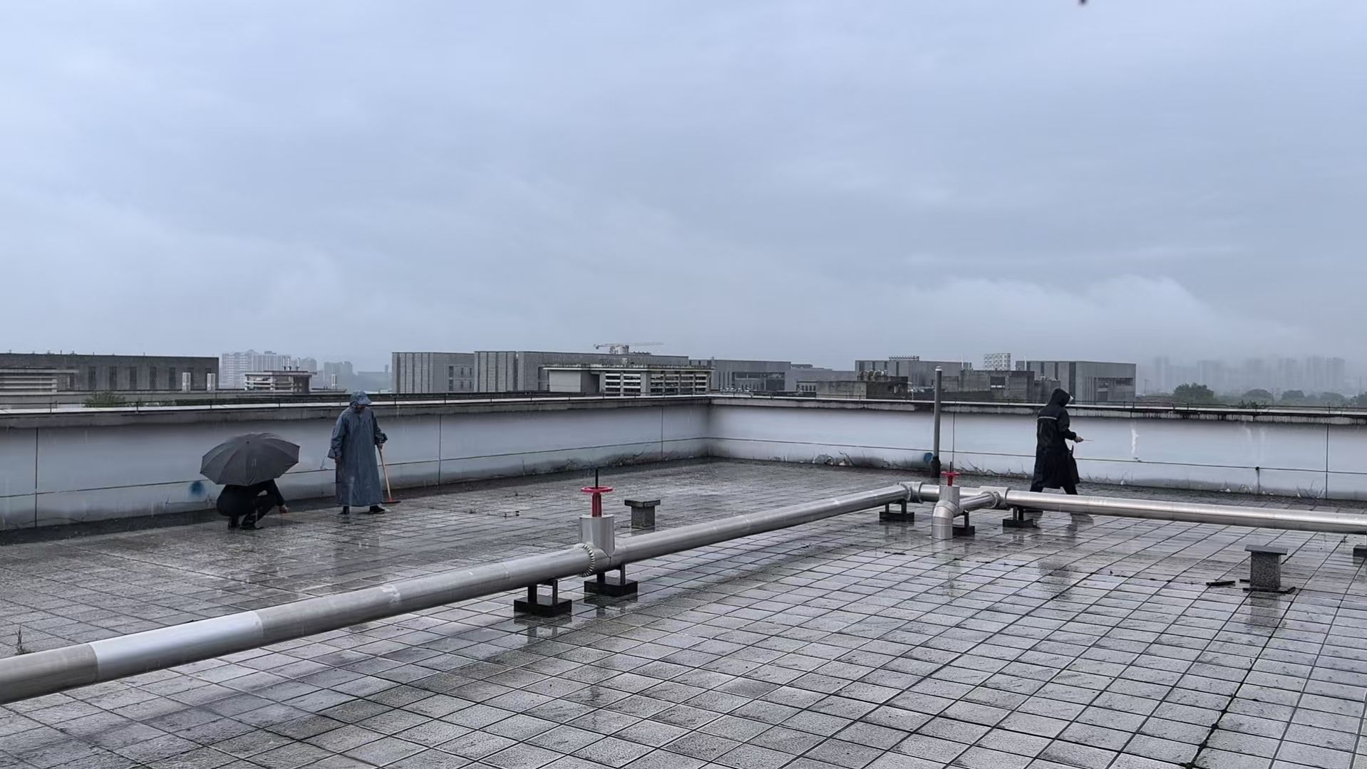 物业员工清理农科楼天台积水