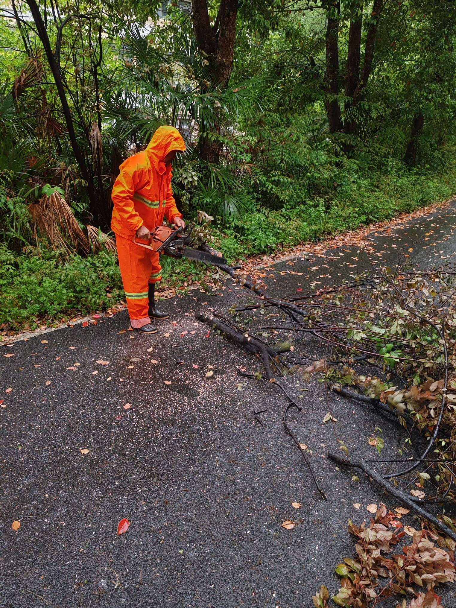 校园绿化工雨中清理树木断枝