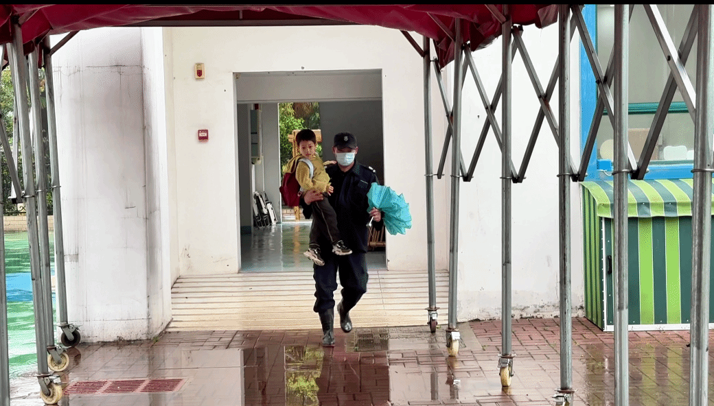 幼儿园保安抱孩子通过积水路段