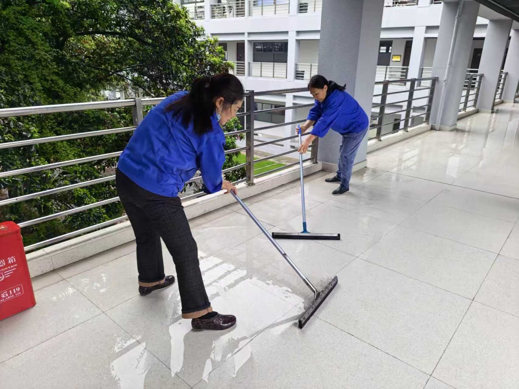 物业保洁员清理教学楼走道积水