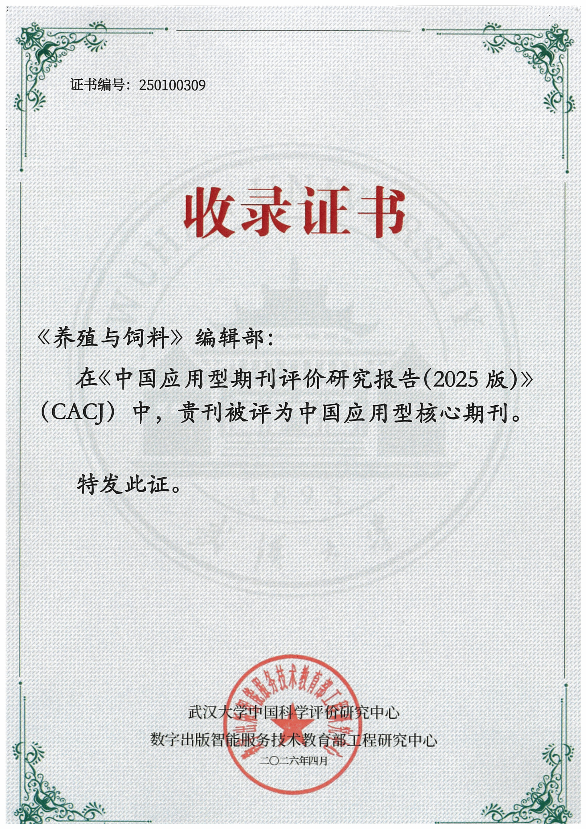 南湖新闻网讯(通讯员 胡敏 赵琳琳)4月10日上午,武汉大学中国科学评价研究中心正式发布《中国应用型期刊评价研究报告(2025版)》。经权威评审认定,《养殖与饲料》入选CACJ中国应用型核心期刊。