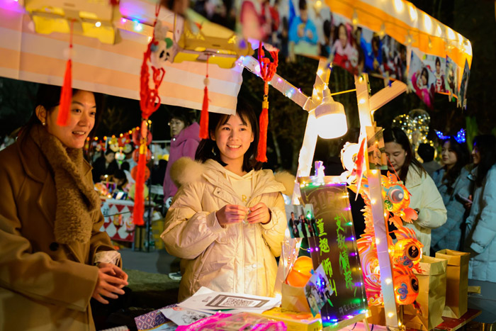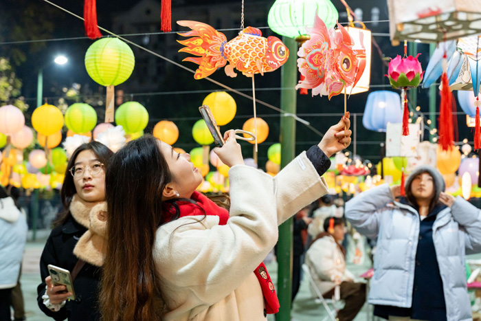 新年庙会灯谜区,一名同学拍灯笼。周子睿摄