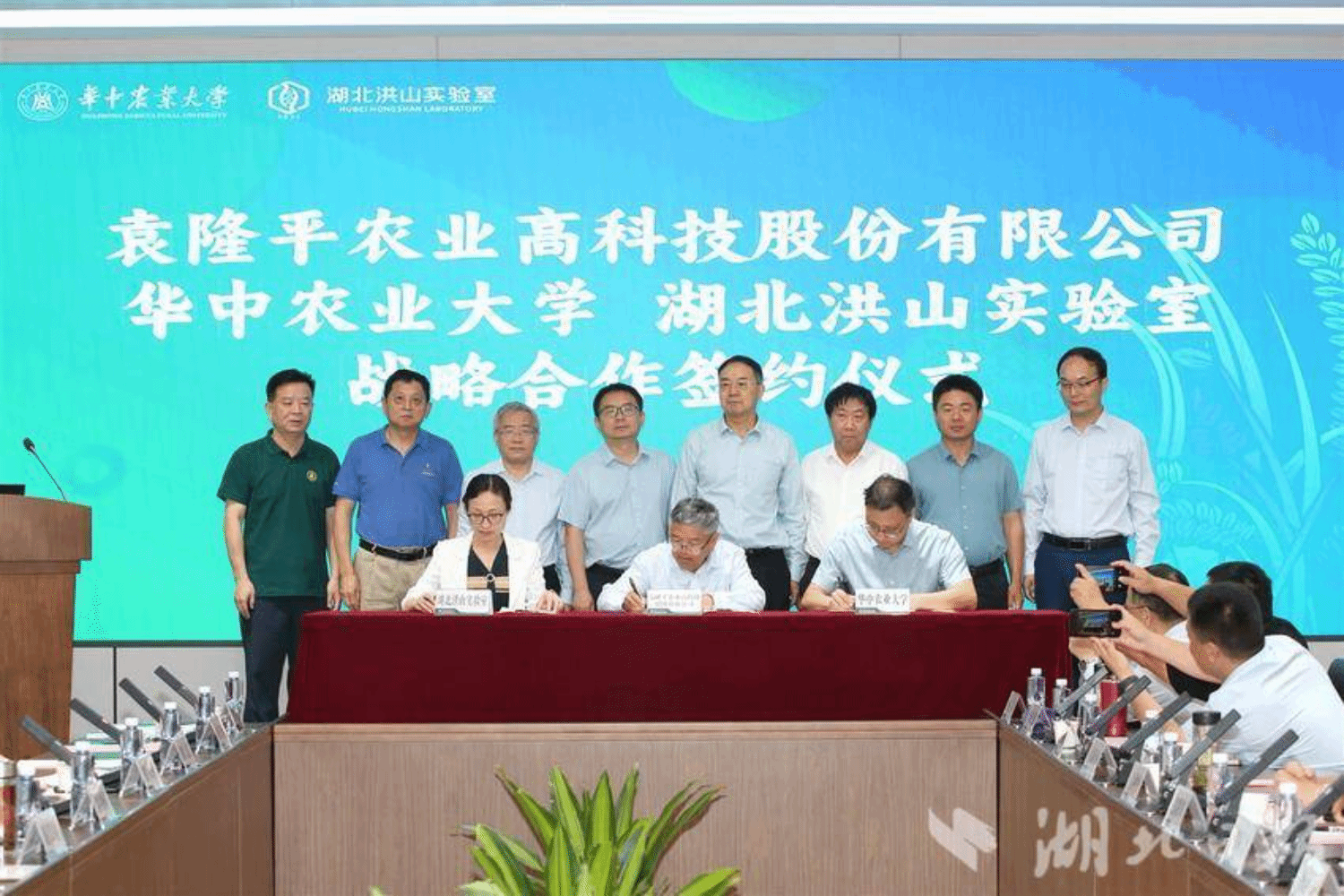 研讨会现场,华中农大、洪山实验室与多家国内龙头企业现场签约。李一博教授说:“利用‘边研究、边开发、边应用’的新型产学研合作模式,研发团队在成果未发表之前,就已与多家企业达成转化开发意向协议。”