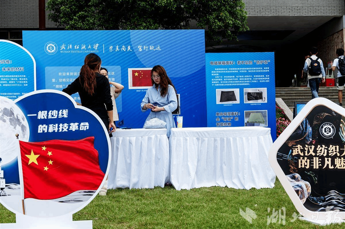 武汉纺织大学展区化身“未来纤维面料实验室”,颠覆大众对纺织品的传统认知。展区中央,一面由玄武岩纤维制成的月面国旗诠释了“从岩石到国旗面料”的科技狂想。以玄武岩为原料拉丝制成的纤维面料——耐温超1000℃、且耐腐蚀、绝缘、阻燃,曾托举嫦娥六号月面国旗屹立月球。同台展示的电磁屏蔽面料如同“隐形护甲”,能阻隔或衰减电磁波辐射。