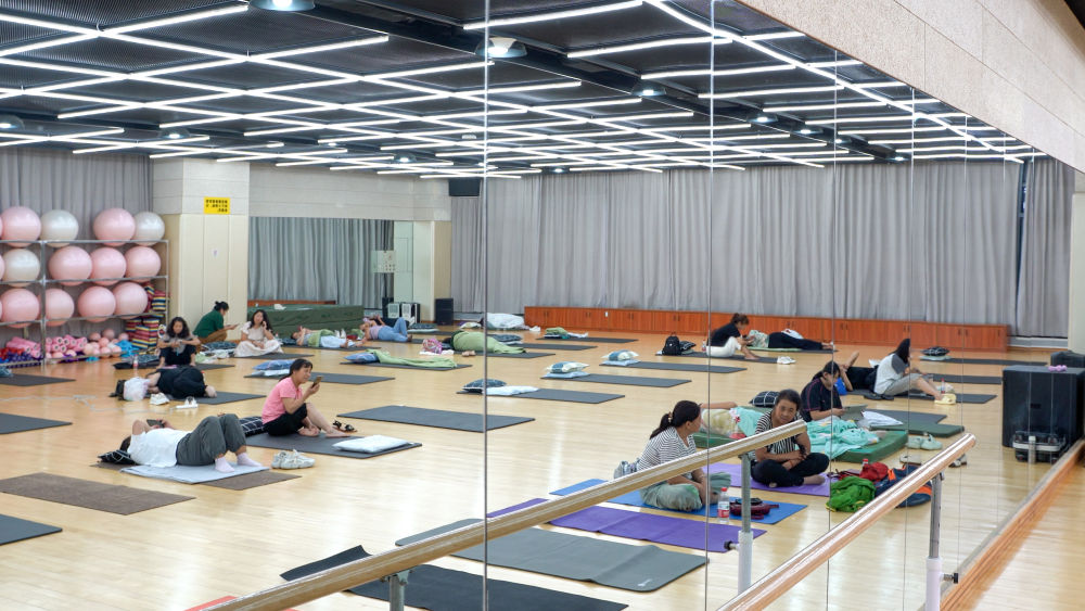 体育馆被收拾得干净整洁,多个功能房被划分为“男性家长休息区”和“女性家长休息区”,每个休息区内整齐地铺好了瑜伽垫,垫子上放着全新的枕头和空调被。已经住进来的家长,有的坐在“床铺”上和家人打着电话,有的在翻阅照片,有的在清理行李准备洗漱。