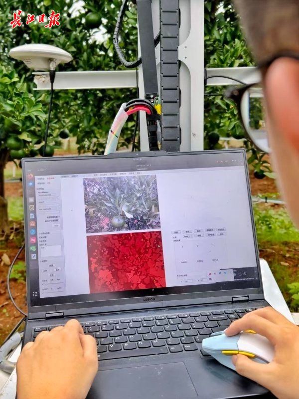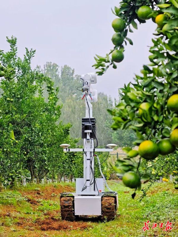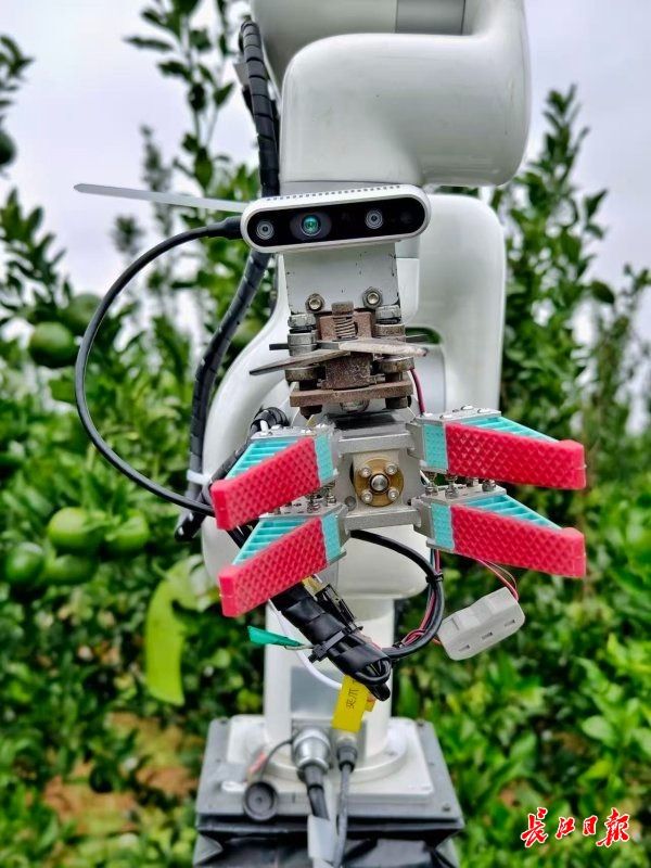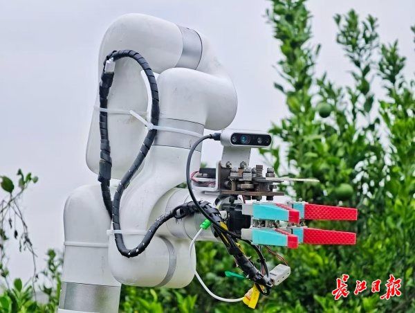 这是该校工学院团队历时4年研发出的柑橘采摘机械臂,已进入定型试验阶段。它能在“万绿丛中”快速精准识别柑橘方位,计算出最佳采摘路径,不伤果,不伤枝,有望解决柑橘采摘的难题。
