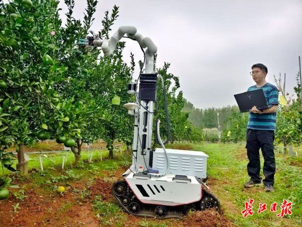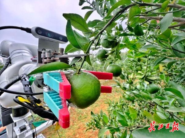 10月17日,记者走进华中农业大学的柑橘试验田,看到一台高2米、宽1米左右的机械装置正在田间自如行走,两边果树上,橘子橙子挂满枝头,即将成熟。科研人员在平板电脑上轻点,机械臂潇洒挥动,将果子握住、剪下,再放入筐里,“快准狠”,一气呵成。