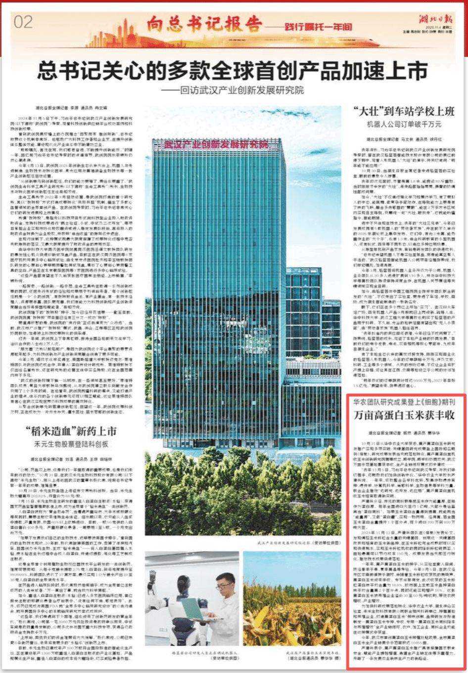 10月31日从华中农业大学获悉,高产高蛋白玉米研究与推广实现多项突破:关键基因研究成果登上国际知名期刊《细胞》,研究成果发表当天就落地转化;高产高蛋白宜机收玉米创新研究院揭牌成立,跨学院、跨学科协同攻关;武汉万亩示范基地喜获丰收,全产业链闭环模式初步建成……