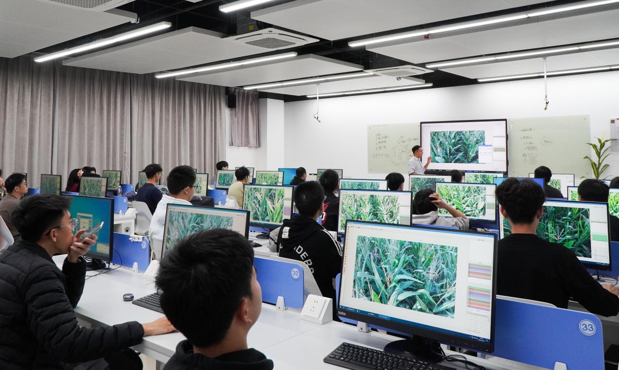 百米之外的逸夫楼机房内,则是另一番景象:同学们神情专注,键盘敲击声此起彼伏,屏幕上跳动的代码勾勒出作物表型的数字轮廓。