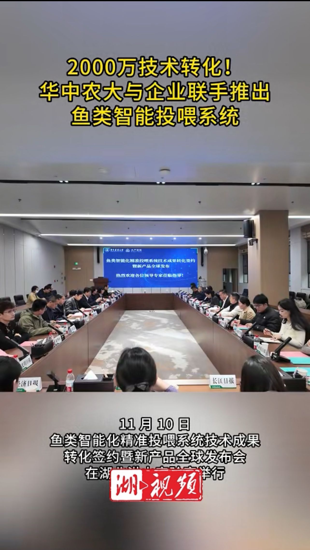 湖北日报讯 (记者韩晓玲、通讯员晏华华、杜乂旻)11月10日,鱼类智能化精准投喂系统技术成果转化签约暨新产品全球发布会在湖北洪山实验室举行。华中农业大学水产学院与深圳盛亚环境技术有限公司签订技术成果转化协议,以2000万元的转化金额达成技术独占许可合作,许可期为20年。