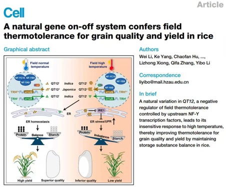 华中农业大学作物遗传改良全国重点实验室、生命科学技术学院、洪山实验室水稻团队李一博教授课题组历经10余年研究,从来自中国、菲律宾、巴基斯坦、印度尼西亚、埃及、印度等国家万份种质中,发现8份在10年自然高温下稳定低垩白的种质,进而通过遗传分析,鉴定出耐自然高温的关键基因QT12,并揭示了其背后的分子机制,为水稻在高温环境下实现稳产提质及育种提供新策略。