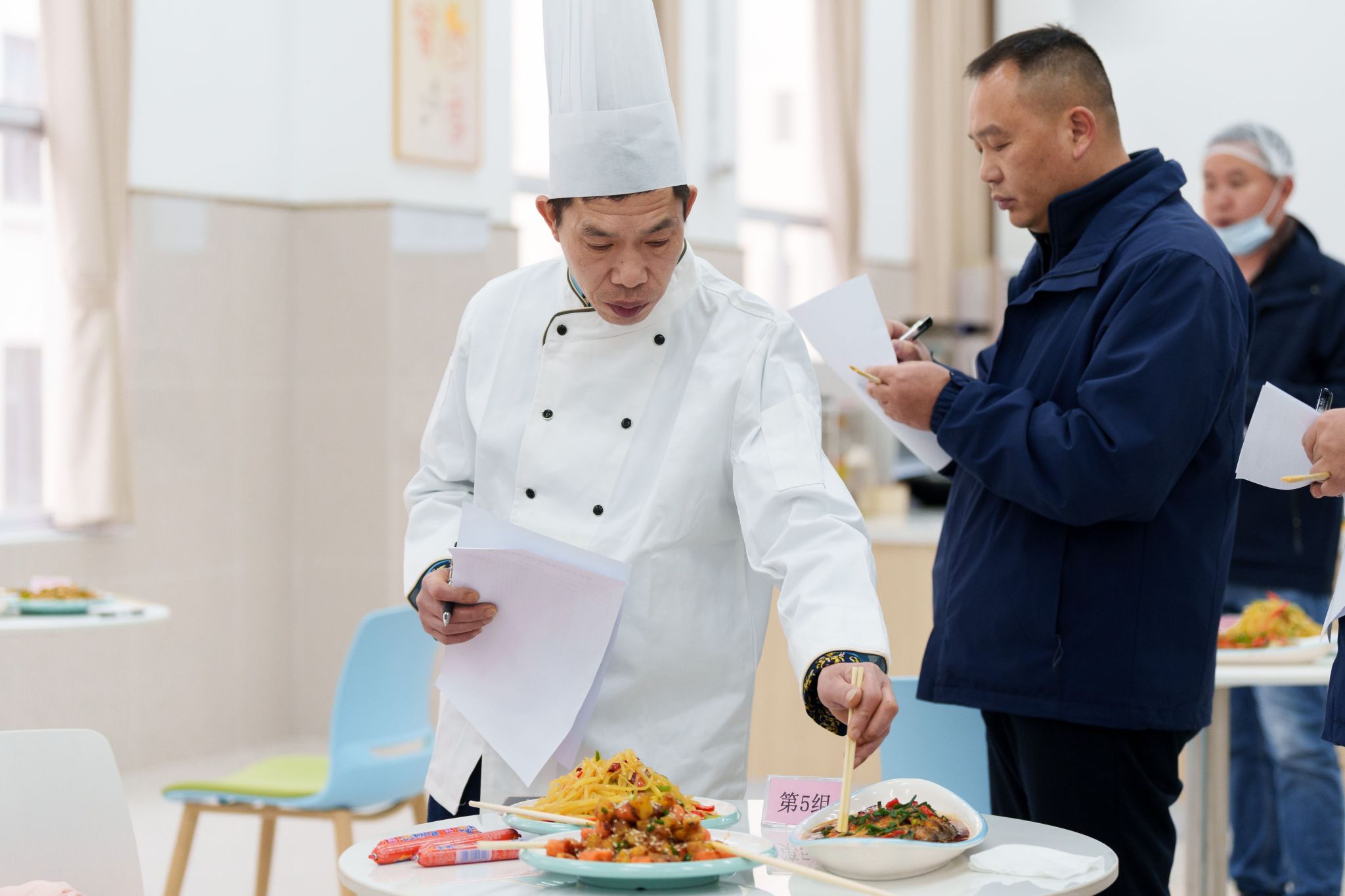 期末考试现场,老师们品尝同学们的菜品进行打分(韩鑫垚 摄)