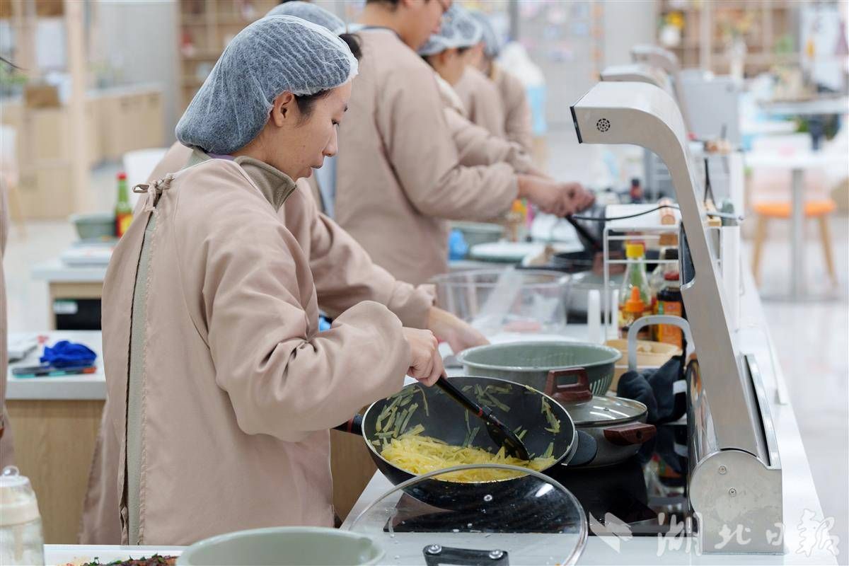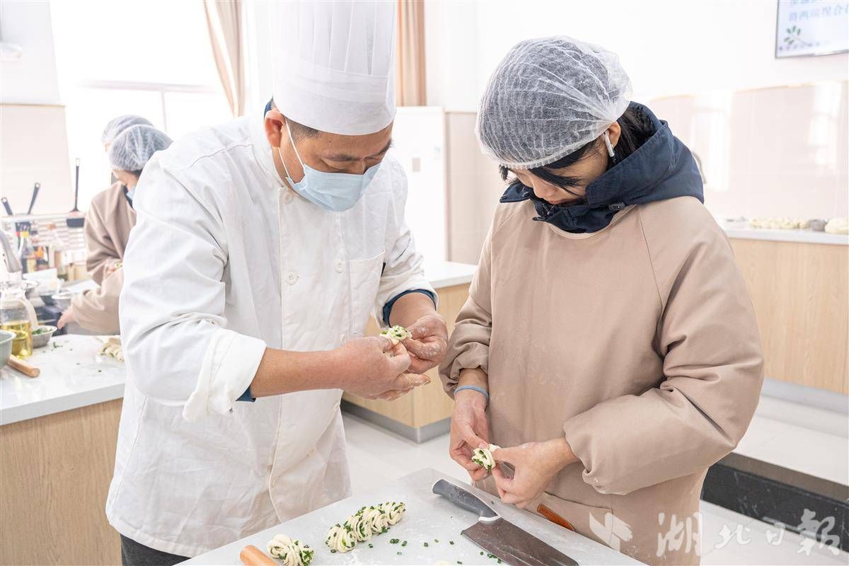 后勤师傅走上讲台,从饮食风俗、地方菜品特色、烹饪美学,到食材选购、处理和烹饪技巧,进行细致讲解。在实操环节,他们走到学生中间,一一纠正操作细节。学生们从课堂上,学会了热拌土豆丝、沔阳三蒸、红烧武昌鱼、排骨藕汤、大馅儿包子、曲奇饼干等的做法。