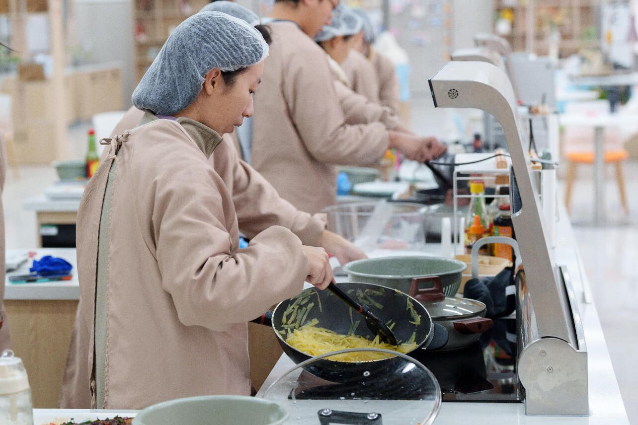 同学们认真聆听,仔细记录,分组动手实践。小组成员分工合作,洗菜、切菜、翻炒、调味,现场忙而有序。他们在师傅的指导下,在和同伴的交流中完成了每堂课的“作业”。油润光亮的热拌土豆丝,香气腾腾的沔阳三蒸,华中农业大学研发的无肌间刺红烧武昌鱼,醇厚浓郁的排骨藕汤,皮薄馅儿大的包子,造型精巧的花卷,金黄酥脆的曲奇饼干……一道道菜品的诞生,都是同学们精诚合作的结果。每一堂课结束之后,氤氲热气中,大家相互品鉴,轻夹一筷入口,无法言说的滋味在舌尖层层化开。