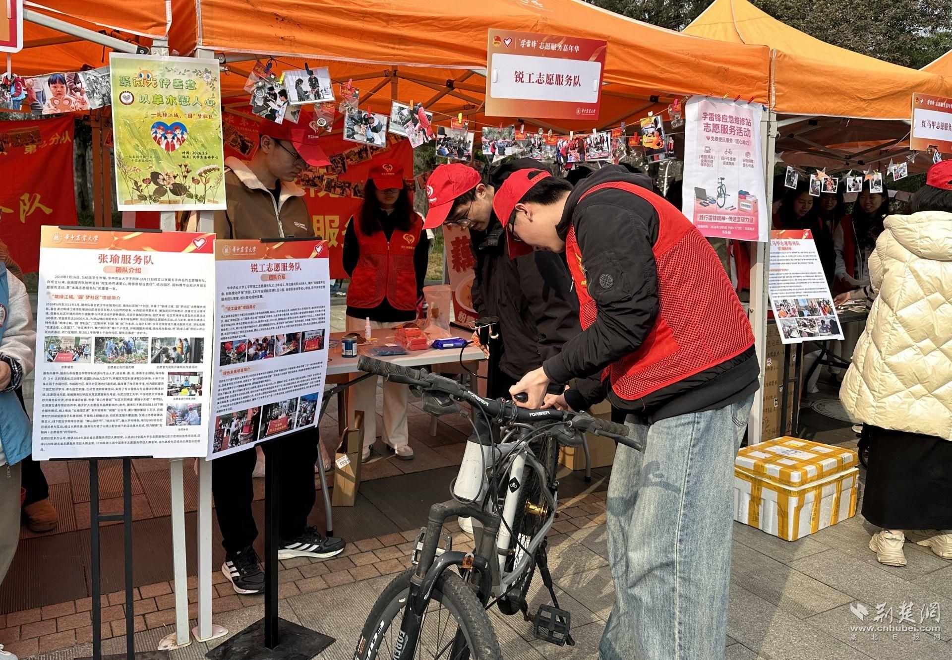 荆楚网(湖北日报网)讯(通讯员 黄端淇 李博涵 魏子淦)3月5日,在第63个学雷锋日和第27个中国青年志愿者服务日到来之际,华中农业大学志愿服务嘉年华在大学生活动中心小广场举行。全校21支本禹志愿服务队分队立足学科专业特色,通过创意展示、互动体验、科普宣讲等形式,集中呈现了华中农业大学在乡村支教、生态环保、社区治理和美校园建设等领域的志愿服务工作与成果,吸引现场众多师生参与。