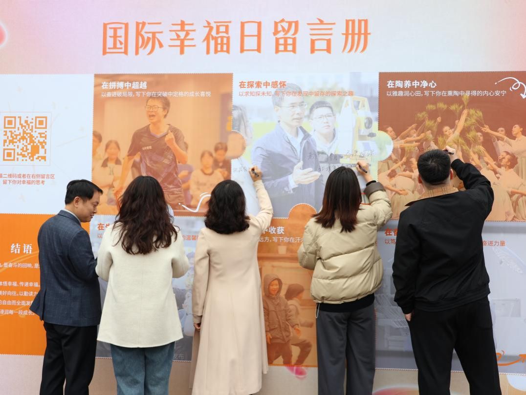 在活动现场,主造型装置汇聚古今中外哲学家、文学家、政治家等对幸福的经典阐释,从孔子“知者乐水,仁者乐山”的哲思,到习近平总书记“幸福都是奋斗出来的”的号召,再到马克思“真正的幸福在于人的潜能的全面发展”的观点,一字一句启迪师生对幸福的深层思考,探索新时代人的自由而全面发展的实践路径。