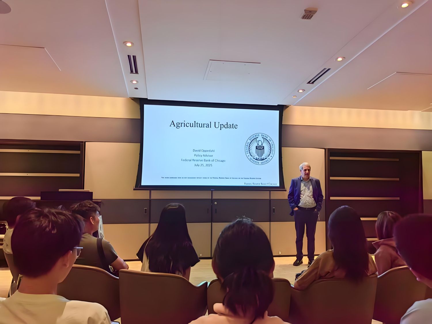 在芝加哥联邦储备银行,高级政策顾问David Oppedahl以农业信贷体系为切入点,系统性地阐释了货币政策传导机制。他通过“联邦基金利率-商业银行基准利率-农业贷款利率”的传导链条,生动展现了量化宽松等政策工具如何影响农场主的融资成本及农产品国际贸易的信贷环境。随后,师生们来到被誉为“金融史教科书”的联邦储备银行货币博物馆。在近千件展品中,从1914年美联储初创时期的票据到2008年金融危机时的紧急流动性工具文件,完整呈现了美国货币金融体系的演进轨迹。2022级农林经济管理专业本科生王佳琪谈到,“这一件件展物不仅是货币信用的具象化符号,更串联起从金本位到现代信用货币的演进脉络——它让我理解了国际农产品贸易结算体系背后的金融根基,这堂‘金融历史课’比任何教科书都震撼。”