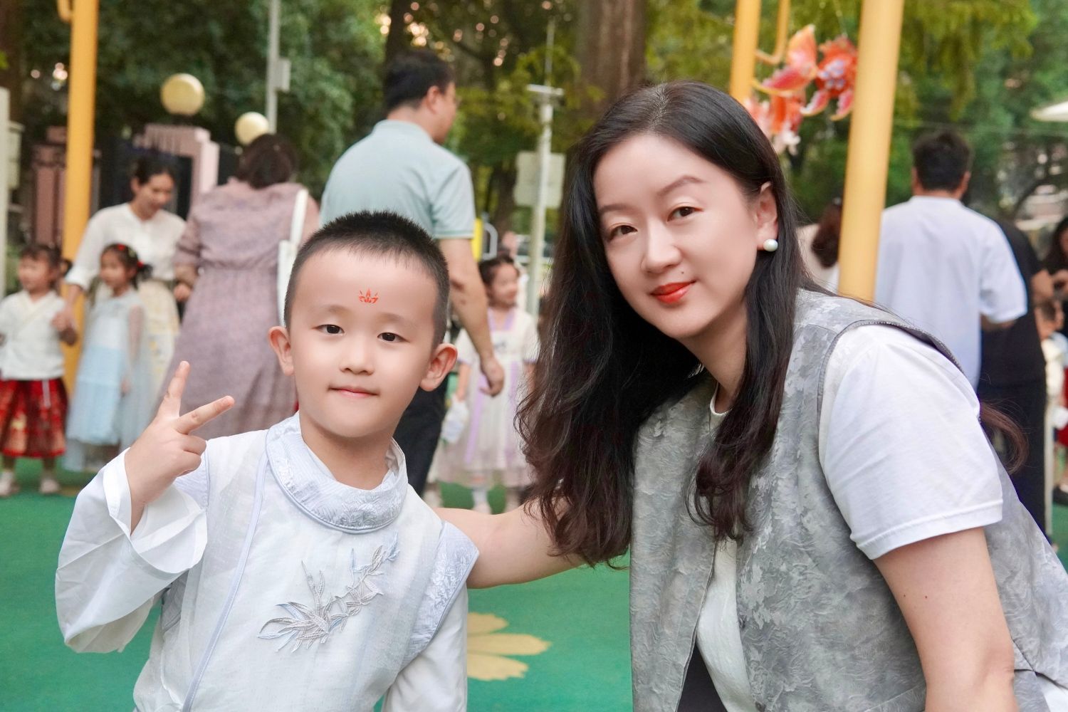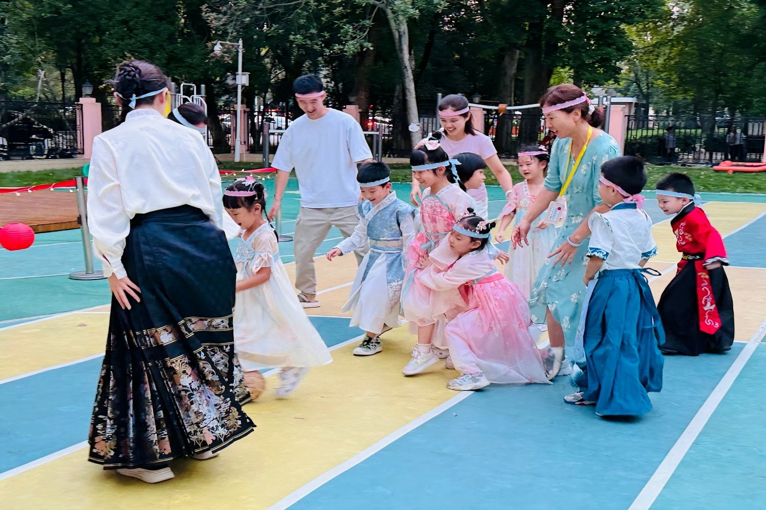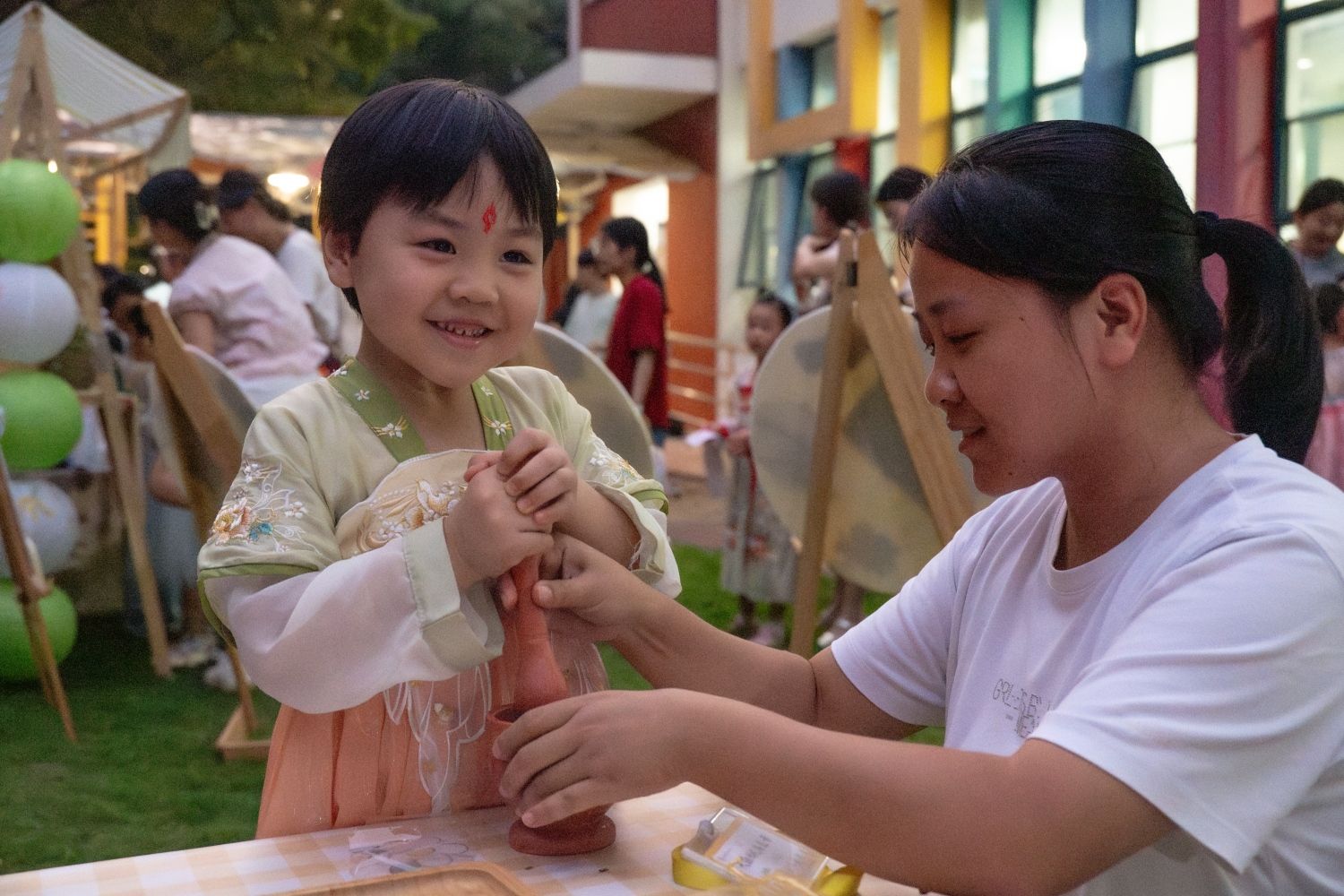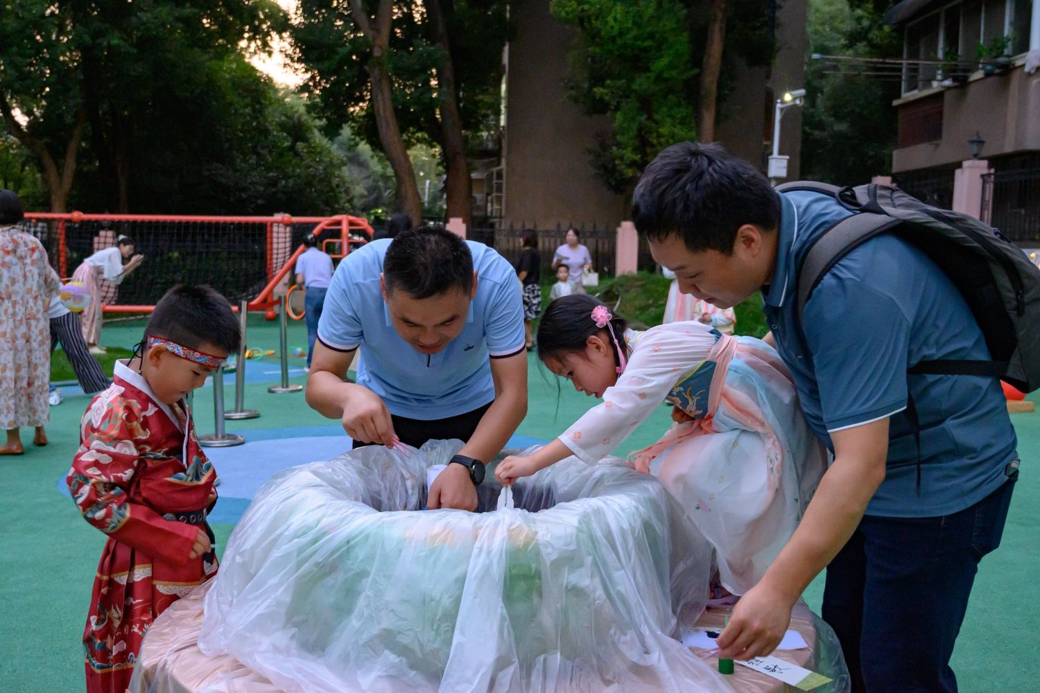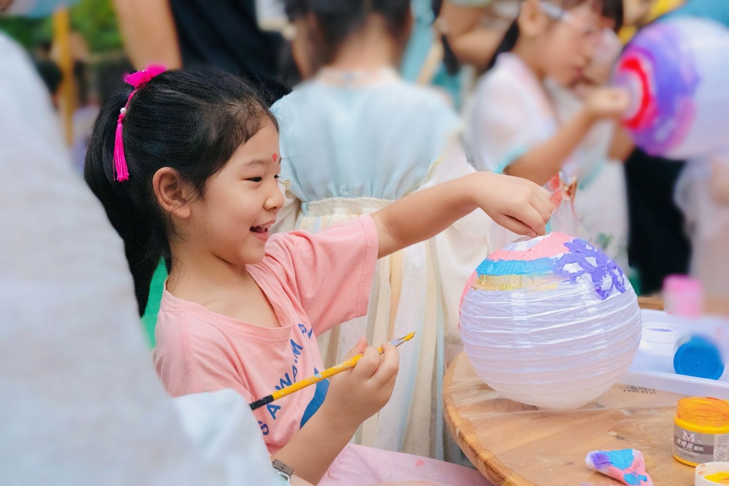 傍晚六时整,孩子们身着色彩绚丽的汉服,与家长一同,在柔光与音乐中,开启了“月光集市•忆中秋”游园之旅。
