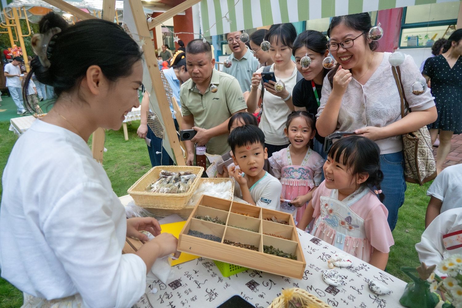 参与最热烈的活动当属中秋古法香囊的制作环节。老师在游戏中通过各种方式“考察”每一个小朋友,通过视、听、触等感官让小朋友们更直观地了解中国香料知识。在老师的指导下,孩子们与家长一起挑选香料、研磨、填充、装饰,制作出独一无二的中秋香囊。摊位前桂花、艾叶、薰衣草、丁香等香气交织,承载着满满的祝福与心意。