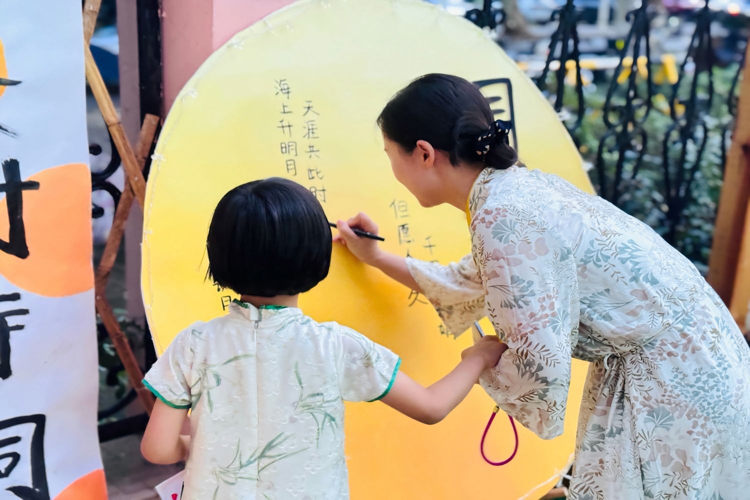 空白的宫灯在孩子们的绘制下变得五彩斑斓,月亮、玉兔、桂花等中秋元素跃然灯面,成品宫灯悬挂于展示区,灯火阑珊,温暖动人。漆扇活动中,家长与孩子共同在卡片上书写中秋祝福,留下“月儿圆,人团圆”等美好祝愿,同时用丙烯颜料、金粉等材料进行装饰,将普通的卡片变成精美的“漆染”作品,寄托美好情感。