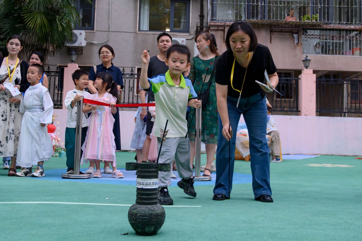 游戏场地上,红蓝两队的大小球员们在场上奋力拼搏,将蹴鞠踢向对方球筐。在紧张刺激的比赛中,孩子们体验了中国古代足球的魅力,也培养了团队合作精神。在“中秋趣投壶”游戏中,孩子们站在指定线后,将箭轻轻投向壶中,亲身体验古代人的中秋娱乐方式,投中后的喜悦笑声久久回响。