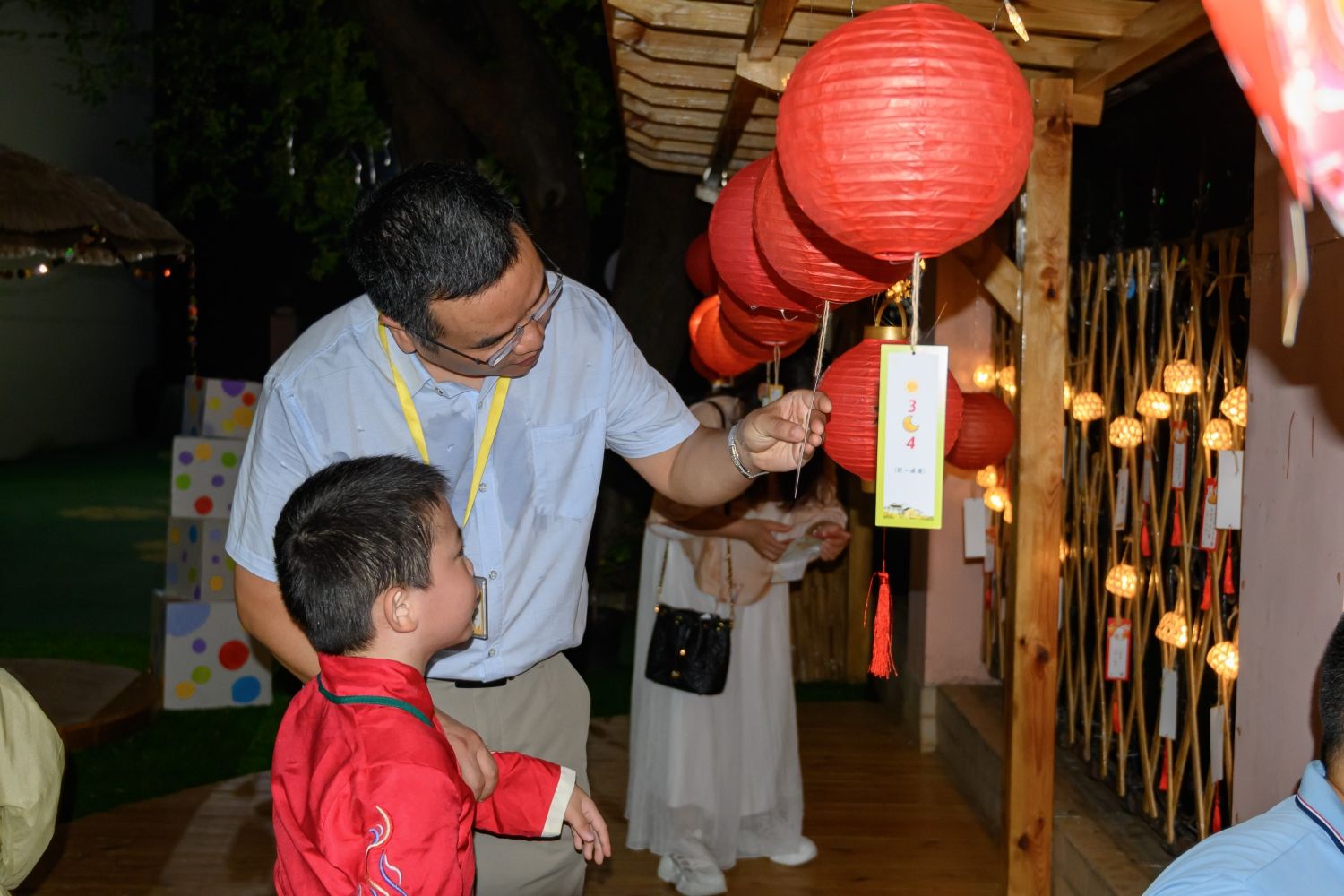 首站“猜灯谜”,幼儿园围栏上挂满了画有图像的中秋灯谜彩条,孩子们与家长一同思考破解,讨论声此起彼伏。飞花令环节中,“月”“花”“秋”等主题字引发孩子们的知识大比拼,在孩子们的笑闹声中,既有“秋夜”“秋雨”等词语的迸发,亦有“举头望明月”的经典和“花好月圆”的美好祝愿。