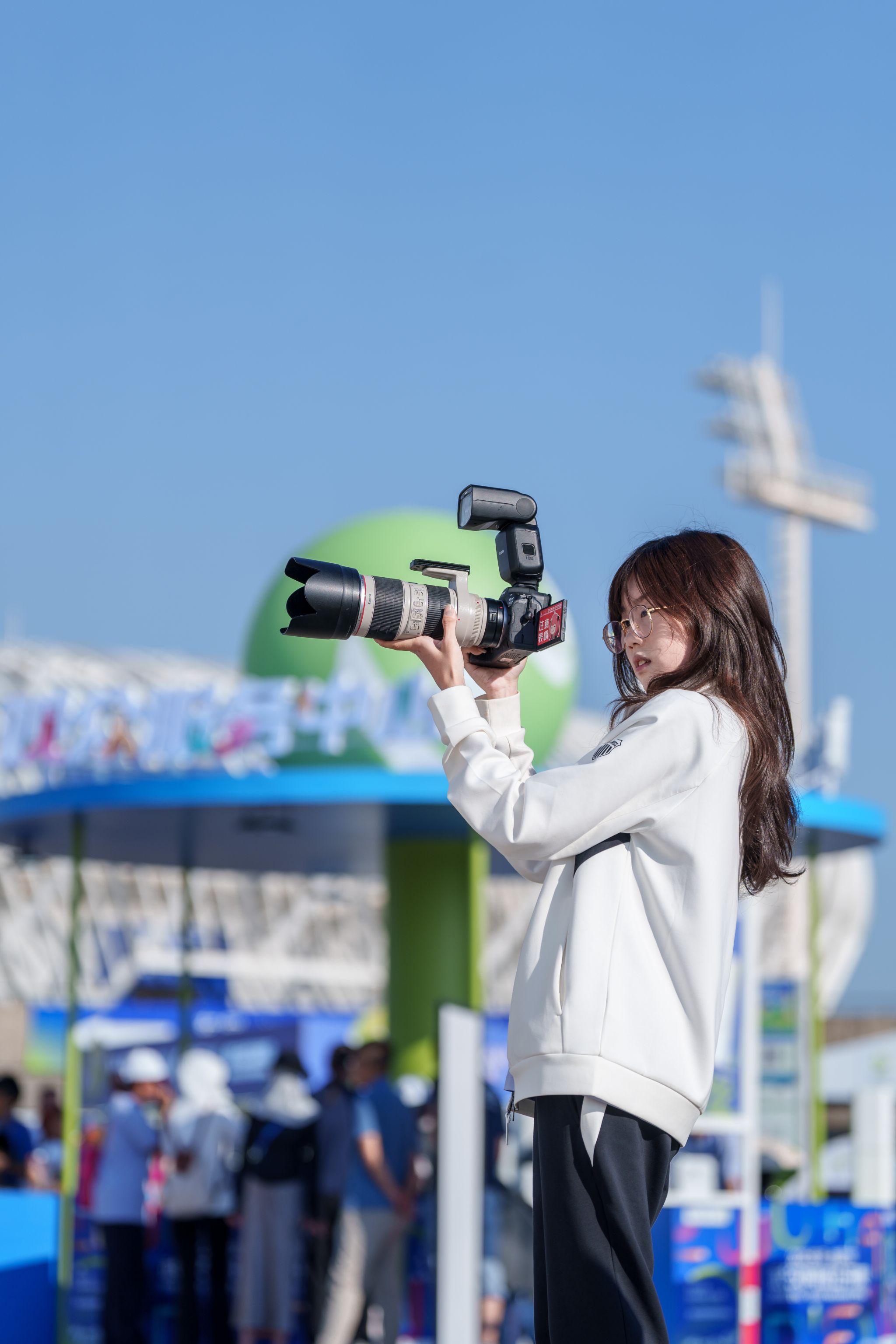 ▲志愿者康雨阳拍摄赛场外精彩瞬间(学通社记者 韩鑫垚 摄)