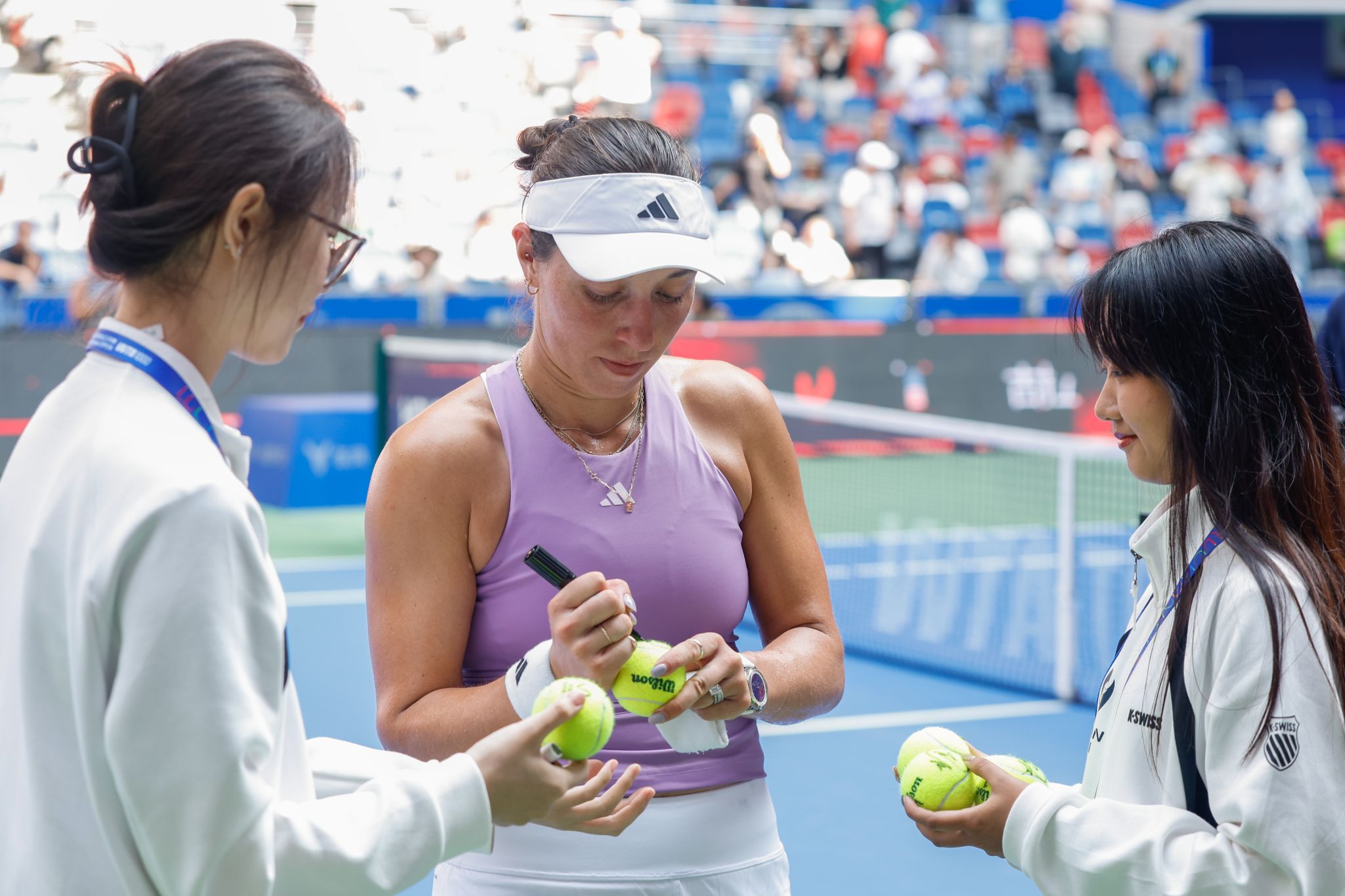 ▲体育展示及球员活动助理岗志愿者谢亦雯(左一)比赛结束后递送美国网球运动员佩古拉的签名幸运球(校团委 供图)
