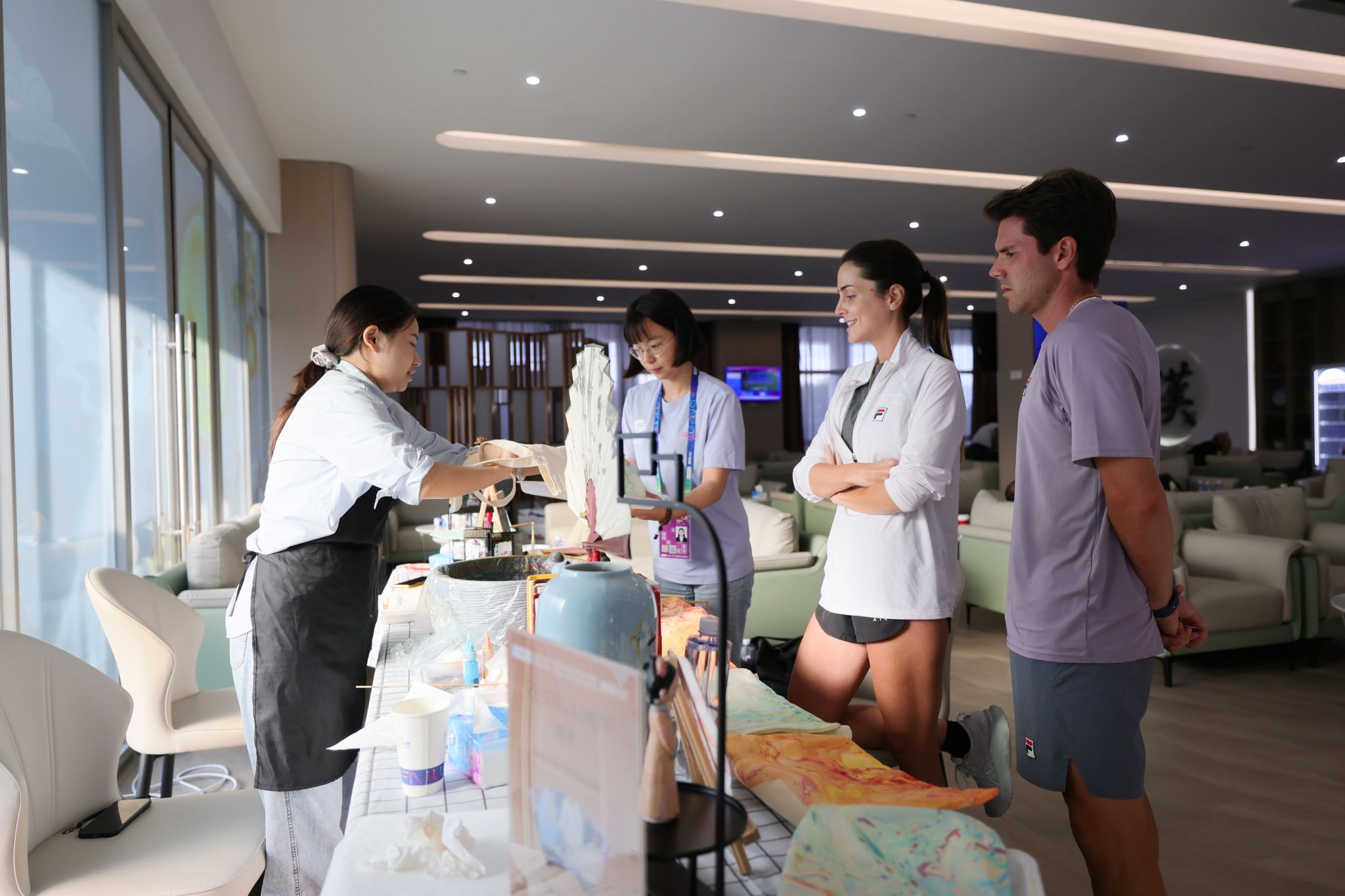 ▲功能房服务助理岗志愿者刘雅文向国际运动员介绍中国折扇(图片来源:2025武汉网球公开赛官方图库)
