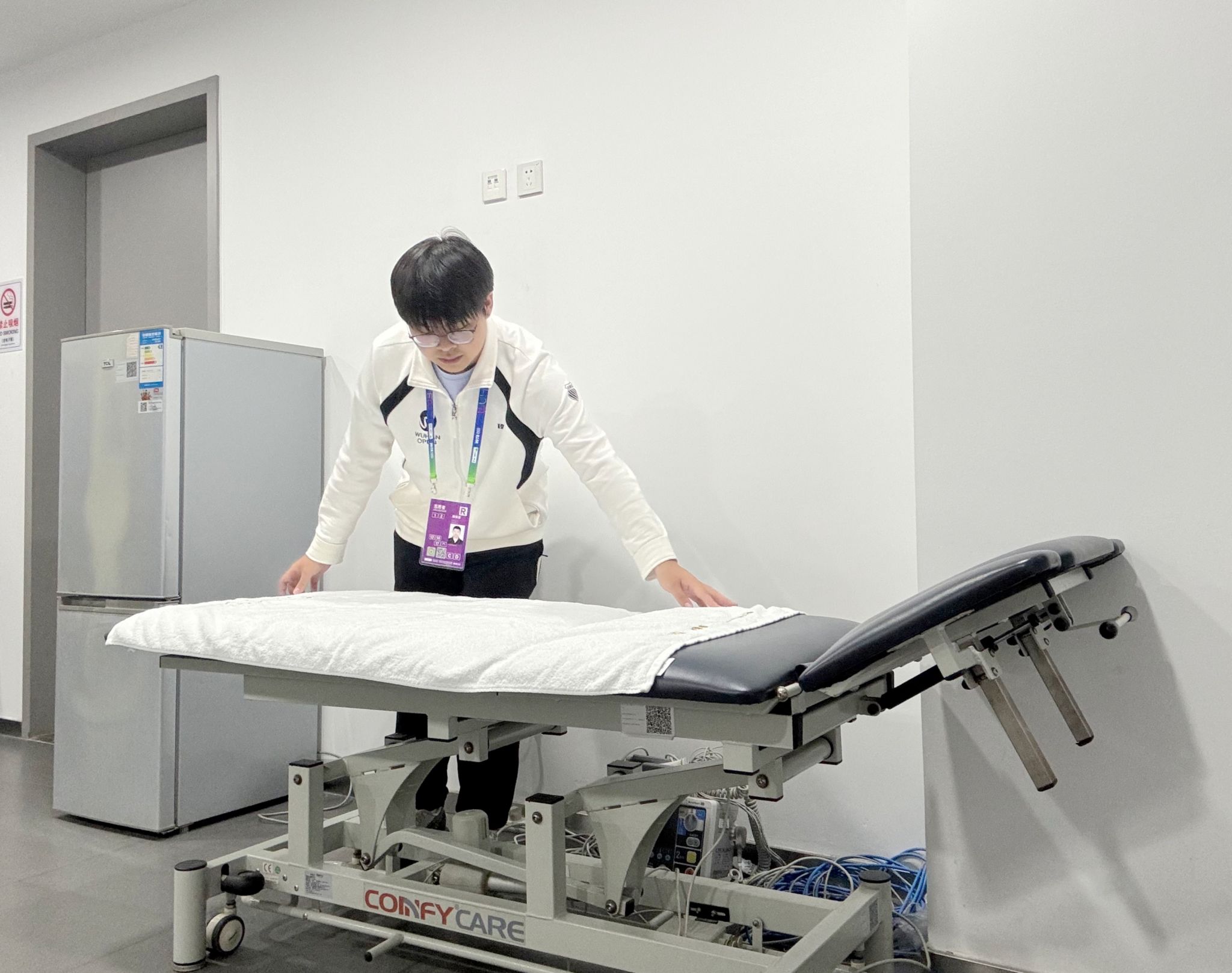 ▲医疗保障助理岗位志愿者康景源正在整理运动员理疗床(校团委 供图)