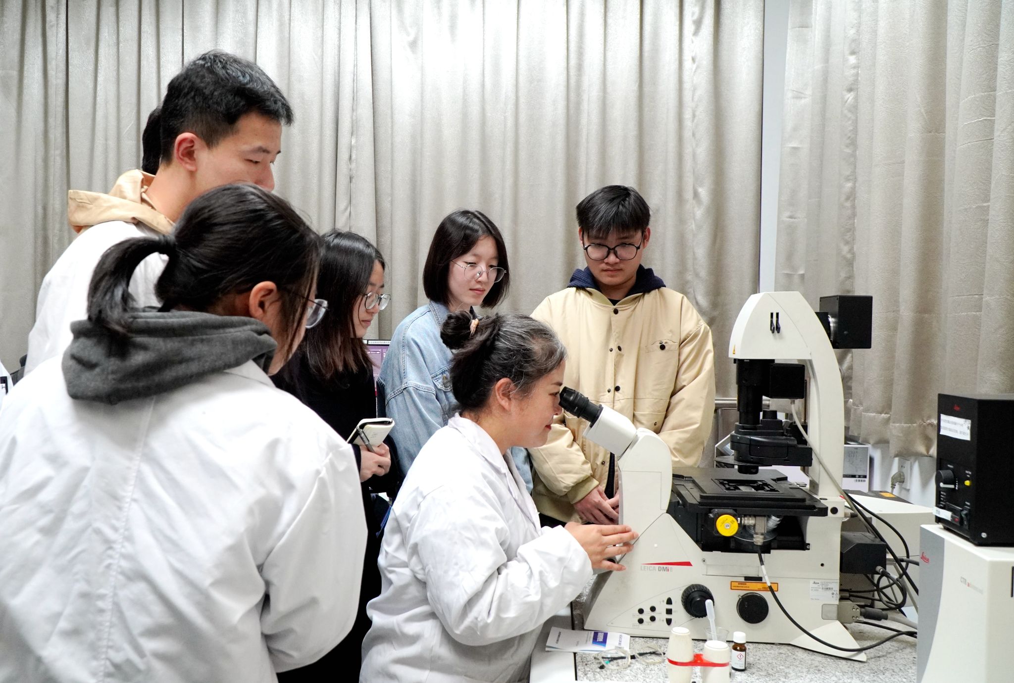 同学们跟随石春梅老师学习激光共聚焦显微镜实验技能(记者 匡敏 摄)
