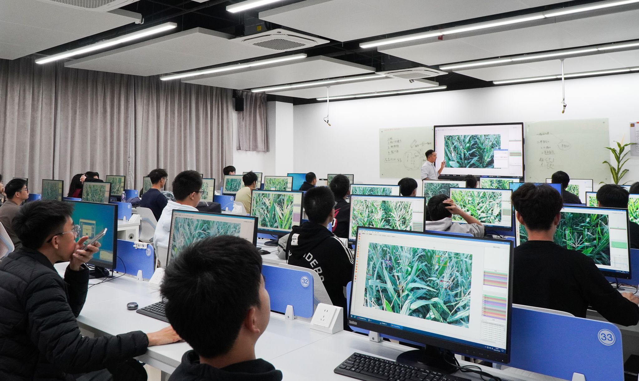 百米之外的逸夫楼 C403机房内,则是另一番景象:键盘敲击声此起彼伏,屏幕上跳动的代码勾勒出作物表型的数字轮廓。