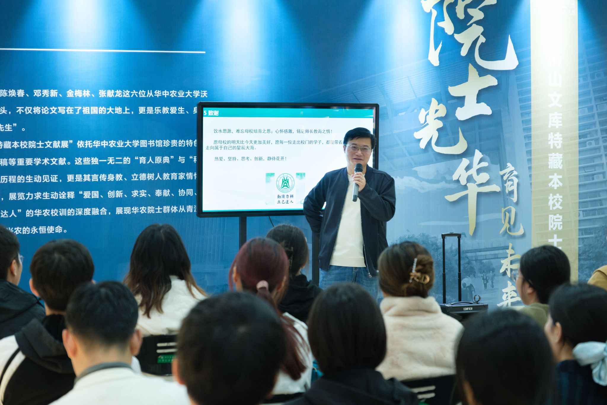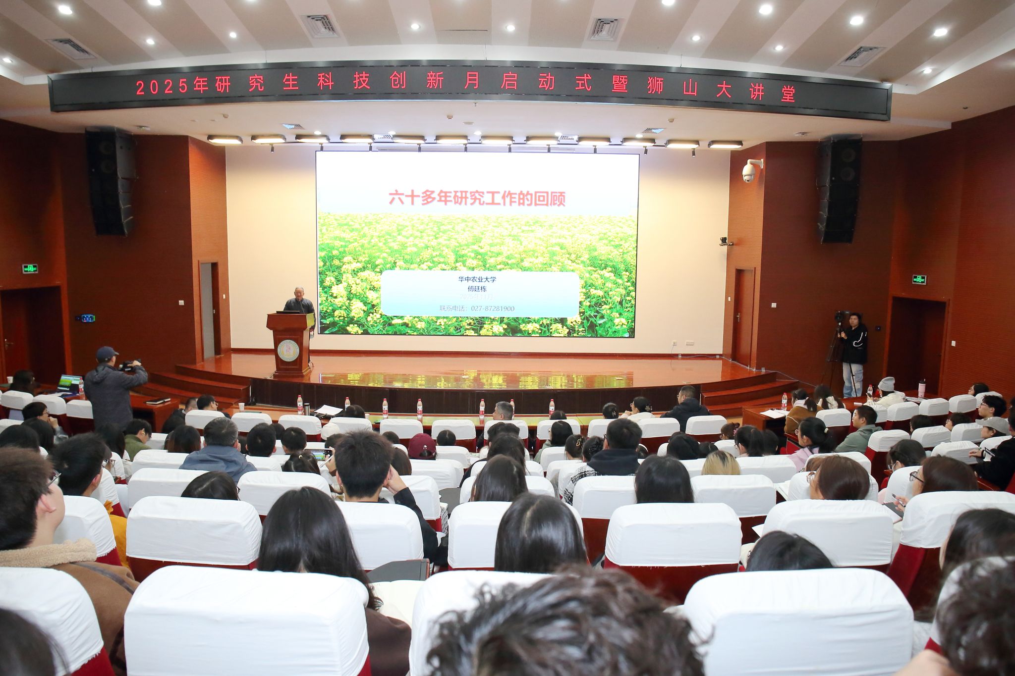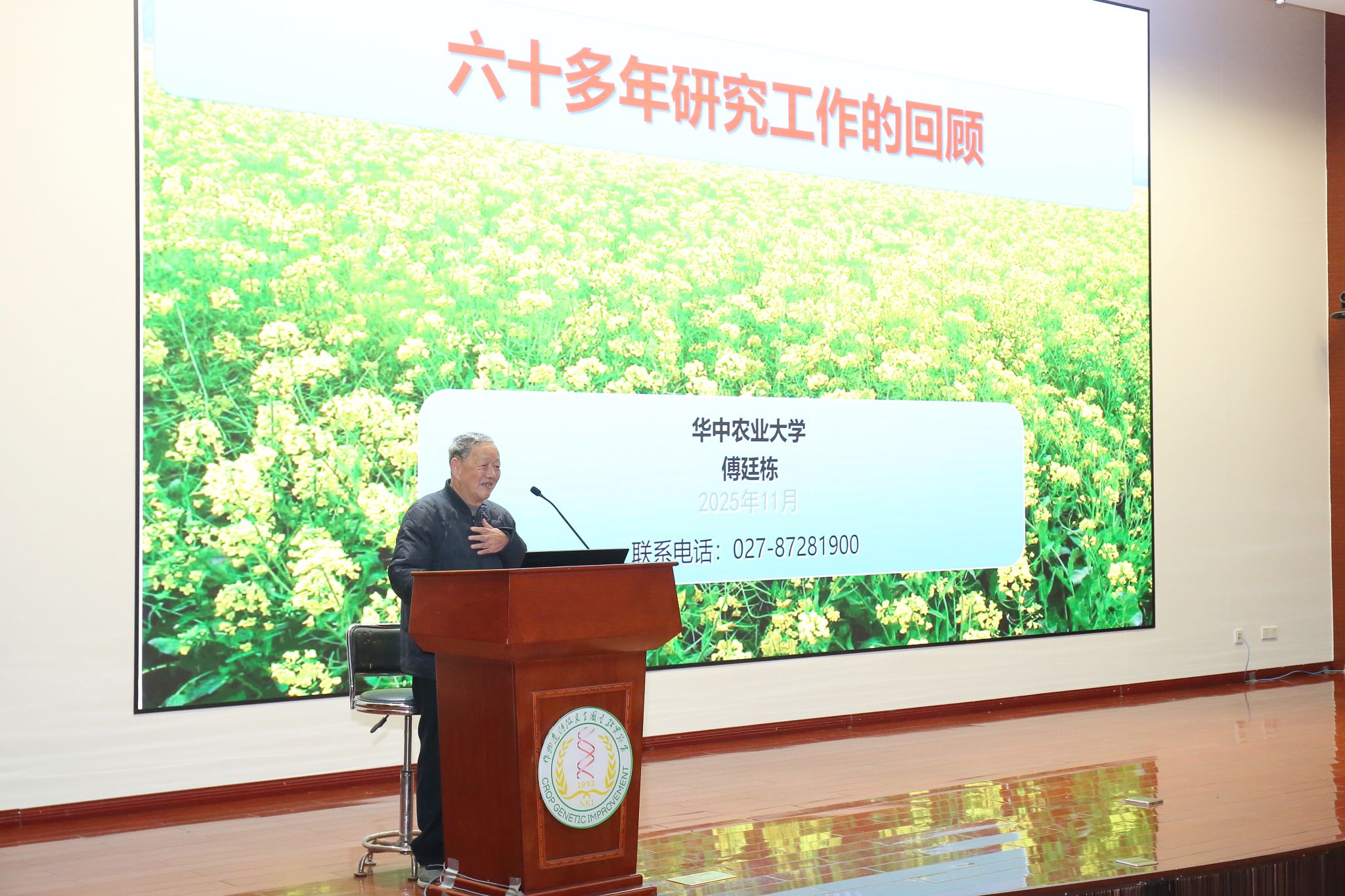 “狮山大讲堂”环节,傅廷栋结合六十余年油菜科研经历,寄语青年学子:研究方向的选择应立足国际前沿、产业需求与国家战略,一经确定贵在持之以恒。他强调,科研就是创新——爱岗敬业是动力,持续学习是基础,深入实际是源泉,交流合作是条件,善于思考是灵魂。面对学生个人兴趣与专业方向存在偏差的疑问,他表示,要调整、适应、培养新的兴趣,同时将其与原兴趣结合,激发科研创新活力。