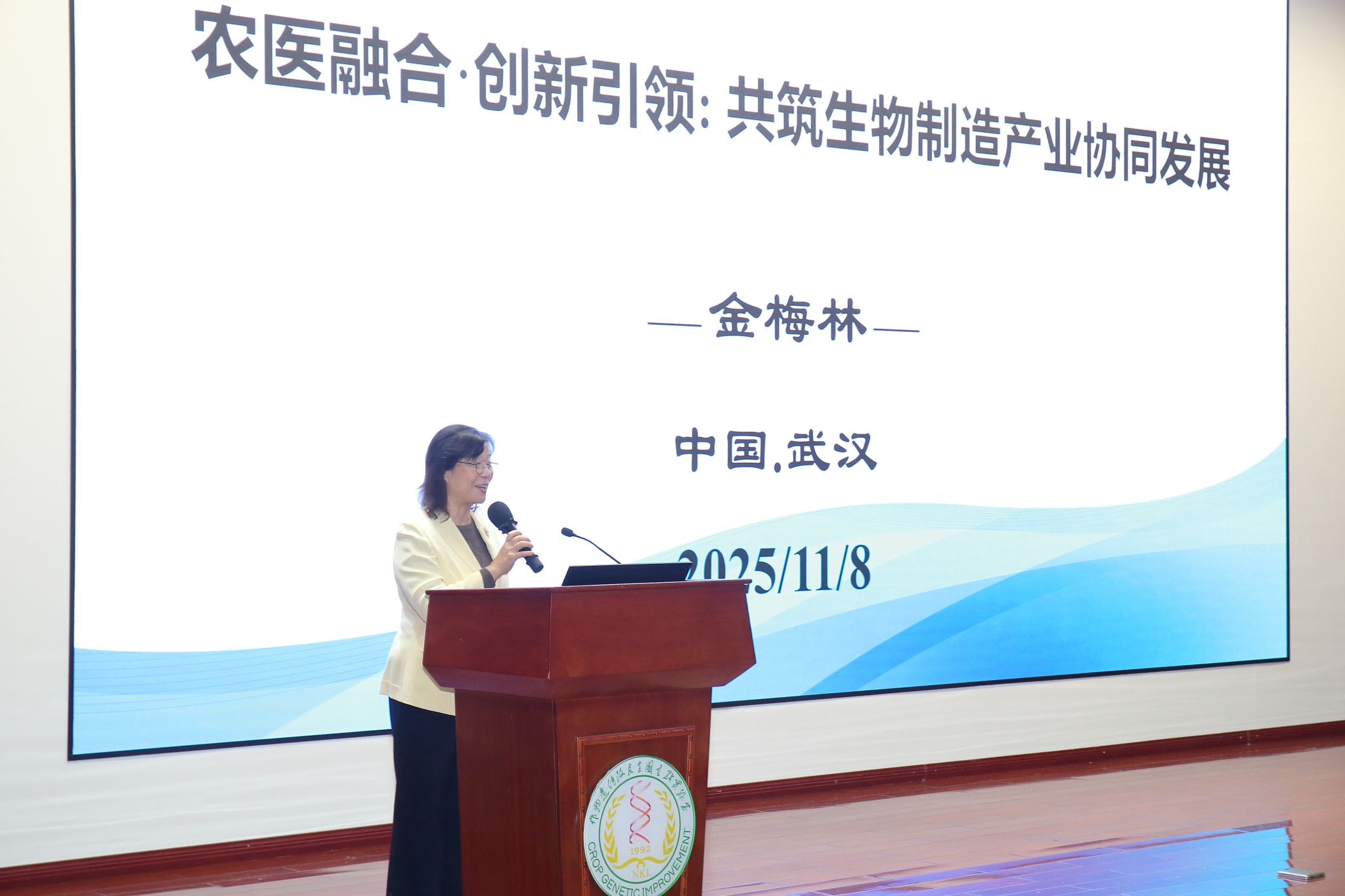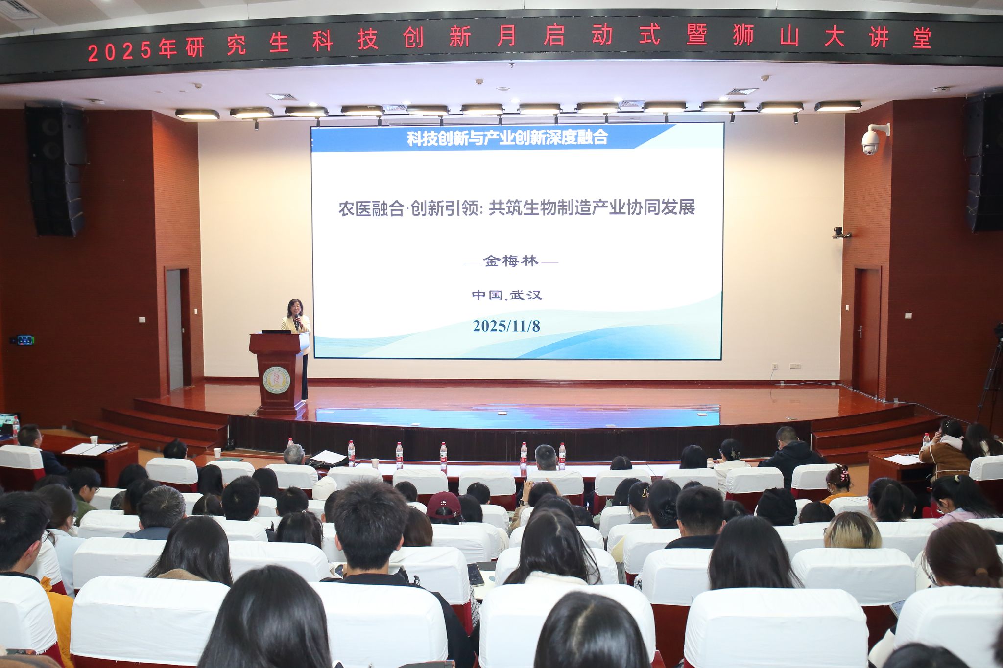 金梅林从国家整体发展形势和国家战略出发,深入分析了畜牧医药事业发展的机遇与重要性。她提出,当前动物疫病防控相关研究的创新与实践,关键在于结合AI与合成生物学构建新质生产力。她叮嘱学生,面对变幻莫测的大千世界,要始终坚守初衷,以“四个有利于”为座右铭应变求进,坚持四个面向、争做四个表率,在顺境中自律精进、稳步发展,在逆境中迎难而上、突破成长。