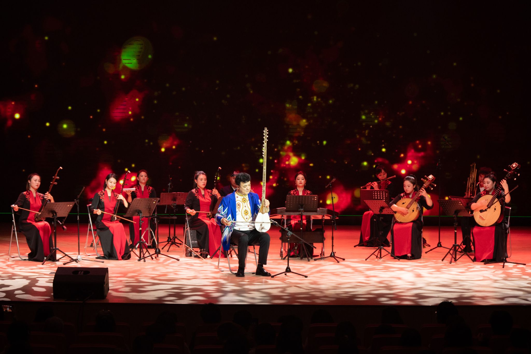 演出最后,中央民族歌舞团民乐团合奏《花好月圆》与《我和我的祖国》,音乐会在温暖的氛围中落下帷幕,剧场中掌声不断。中央民族歌舞团党委书记张庆安携中央民族歌舞团全体演员与我校教师合影留念。